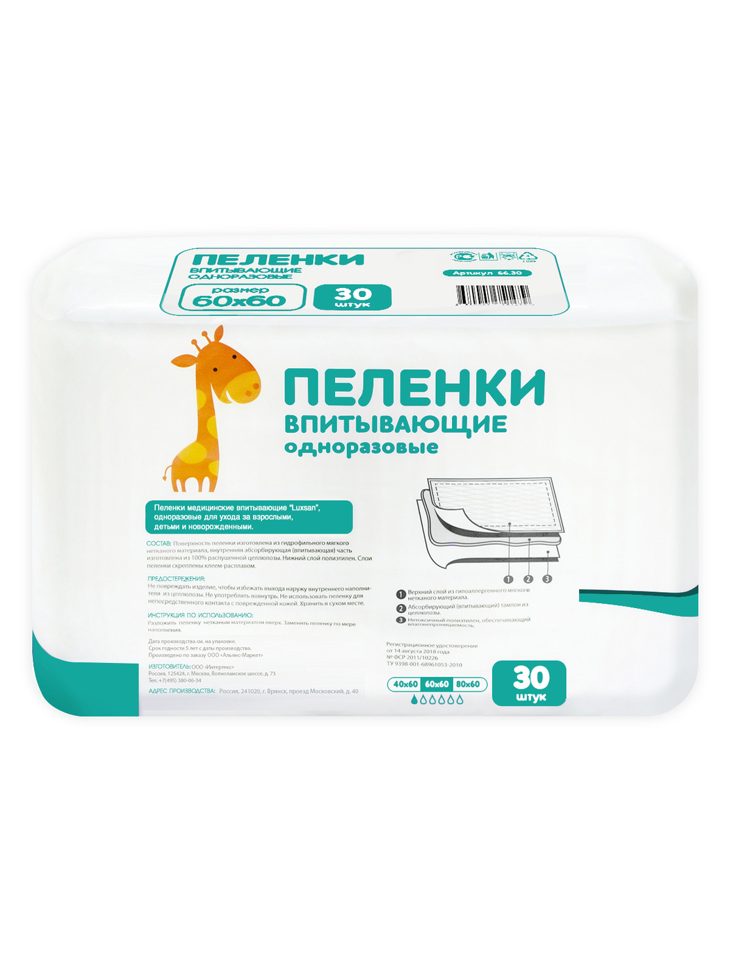 Пеленки впитывающие одноразовые универсальные серии "Жираф". Гипоаллергенный мягкий нетканый материал, абсорбирующий (впитывающий) тампон из распушенной целлюлозы, нетоксичный полиэтилен, обеспечивающий влагонепроницаемость. Не подлежит обязательной серти