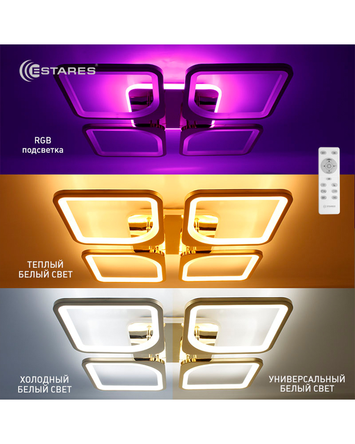 Комплектация:Люстра потолочная , пульт , паспорт изделия Описание:Потолочная светодиодная люстра - светильник с пультом LOOK RGB 100W золото для больших комнат в дизайнерском исполнении. Современный и стильный внешний вид впишется в модный интерьер кварти