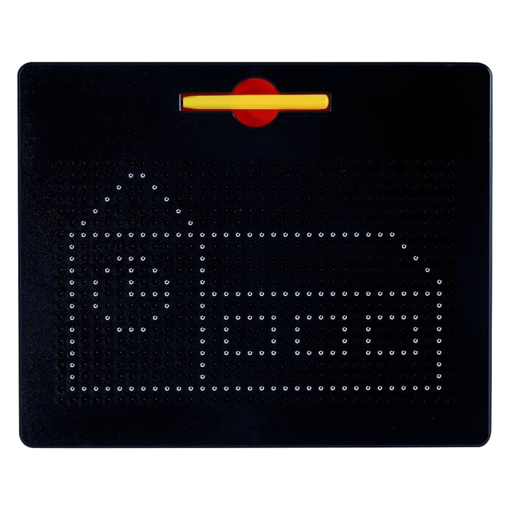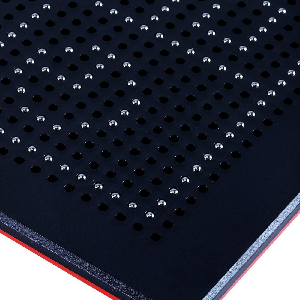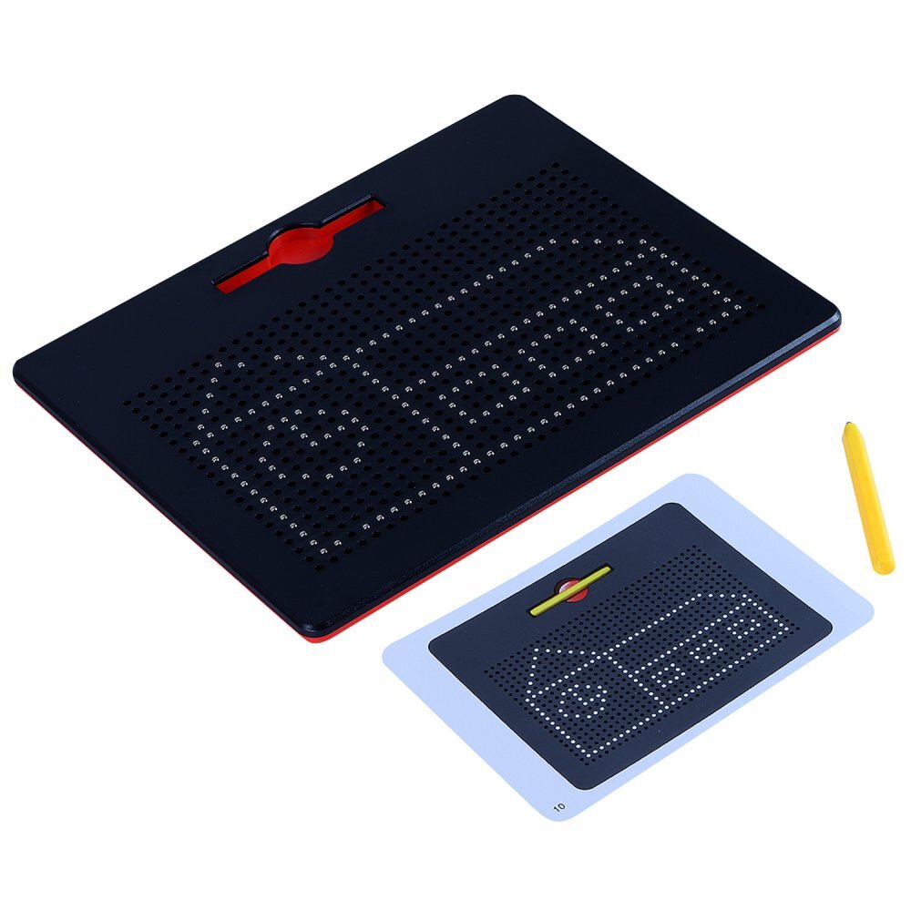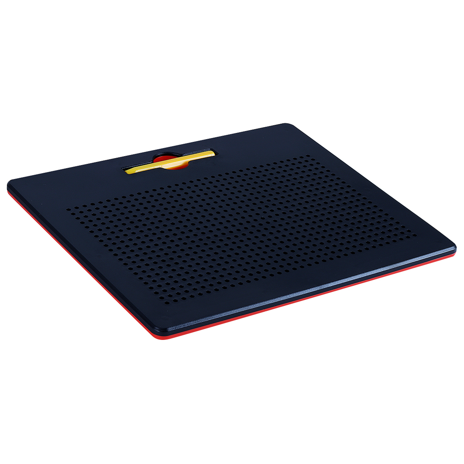 Доска для рисования магнитными шариками в форме прямоугольника понравится малышам. Ребенок будет проводить стилусом по игровому полю и рисовать картинки или учиться писать буквы и цифры. При проведении стилусом в обозначенных местах на поверхности доски п