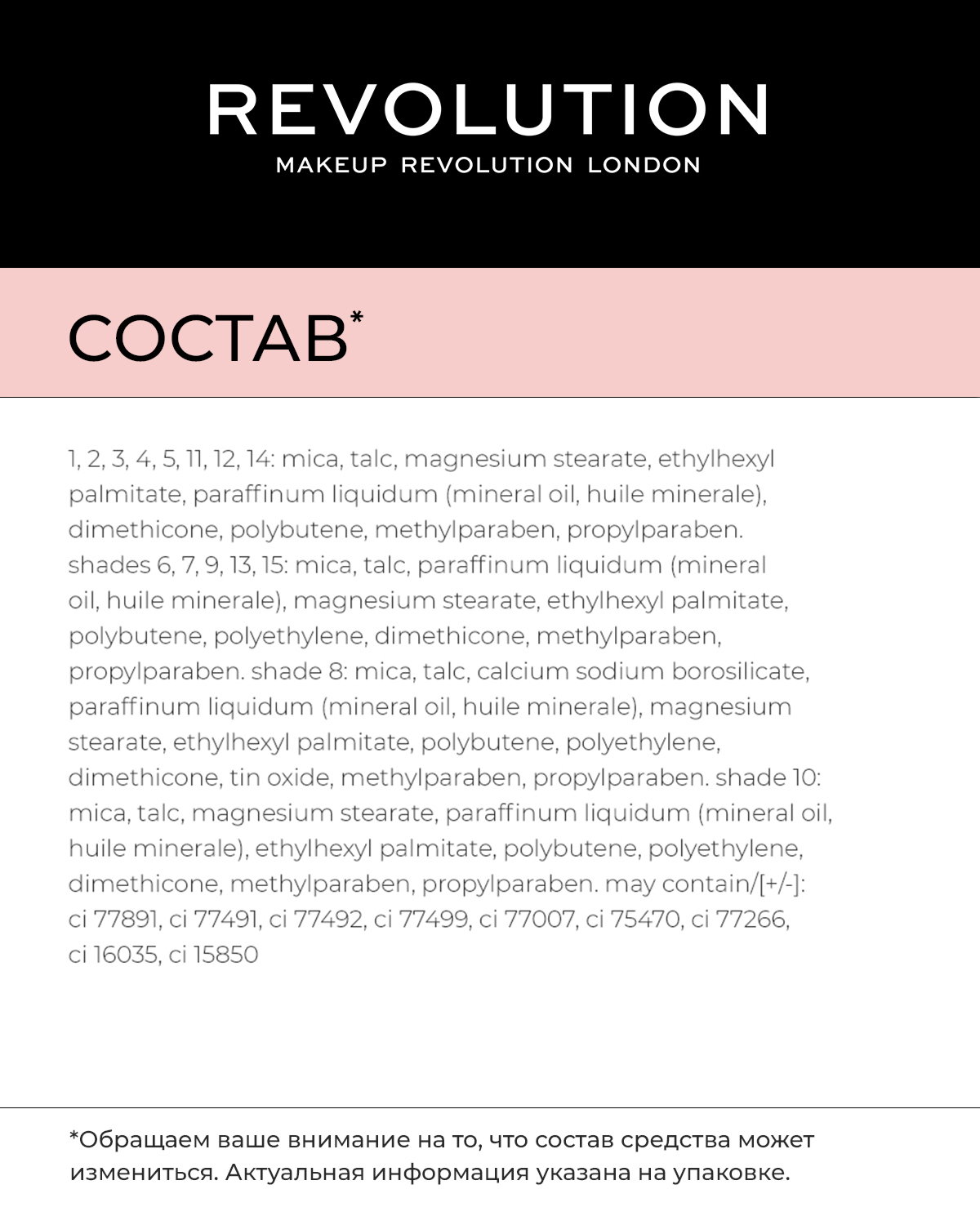 Состав средства:Shades 1, 2, 3, 4, 5, 11, 12, 14: /Mica, Talc, Magnesium Stearate, Ethylhexyl Palmitate, Paraffinum Liquidum (Mineral Oil, Huile Minerale), Dimethicone, Polybutene, Methylparaben, Propylparaben. [+/- May Contain/Peut Contenir: Ci 77891 (Ti