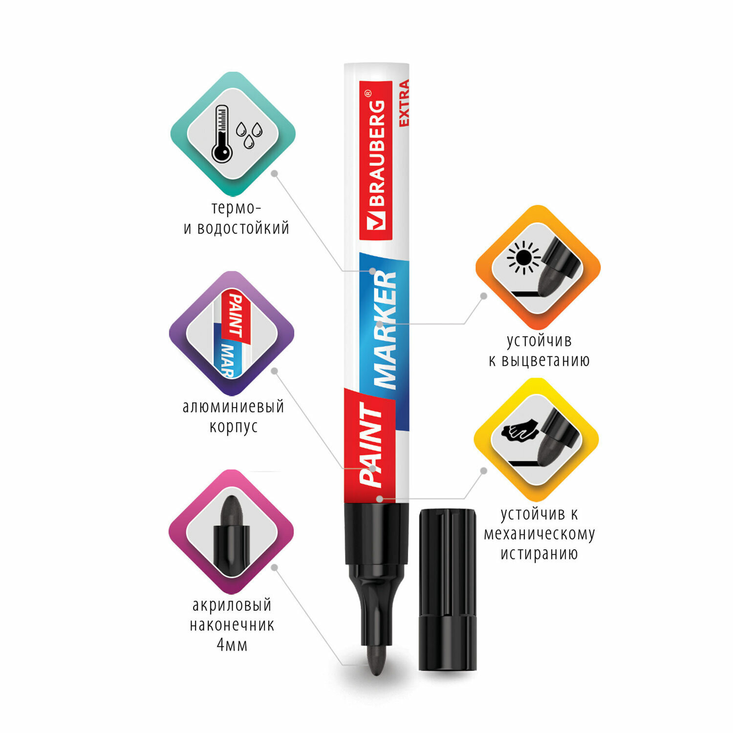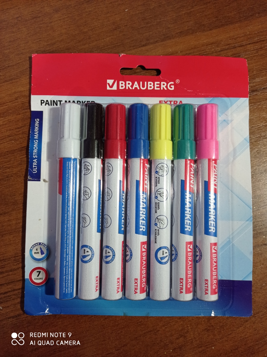 Набор маркеров-красок лаковых BRAUBERG EXTRA предназначен для маркировки на различных поверхностях: бетон, дерево, стекло, металл, резина, пластик как в промышленных, так и в бытовых целях.СПОСОБ ПРИМЕНЕНИЯ:1. Перед использованием хорошо встряхнуть с закр