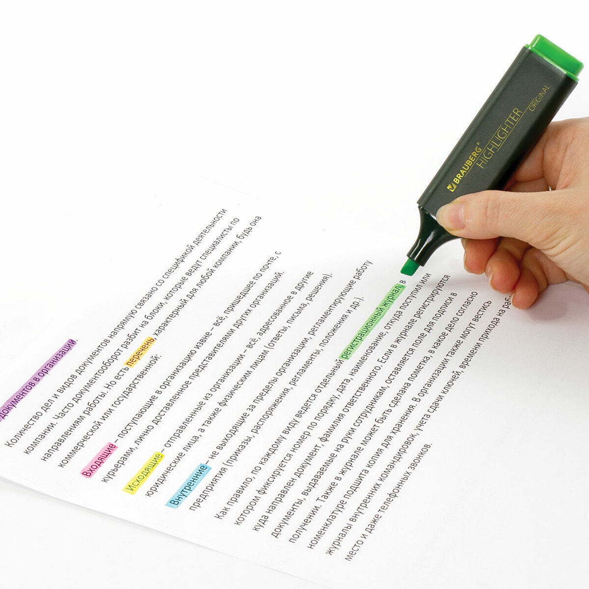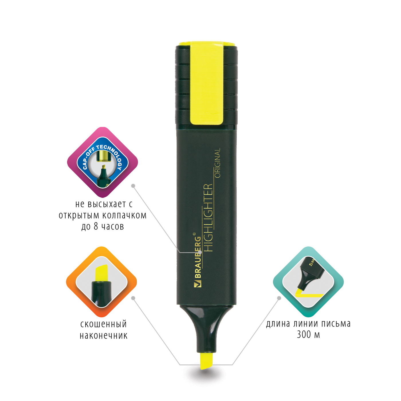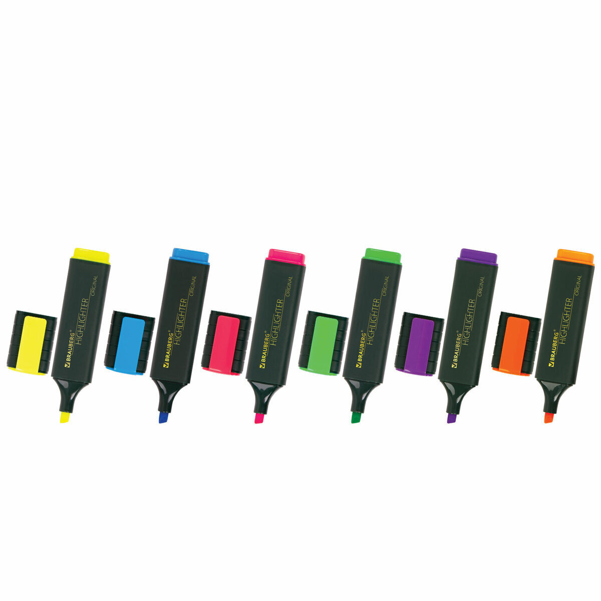 Текстовыделители BRAUBERG "ORIGINAL" предназначены для выделения текста на бумаге любого типа, включая факс-бумагу.В наборе шесть неоновых цветов: желтый, зеленый, голубой, розовый, оранжевый, фиолетовый. Плоская форма корпуса, диаметр которого 25 мм. Ско