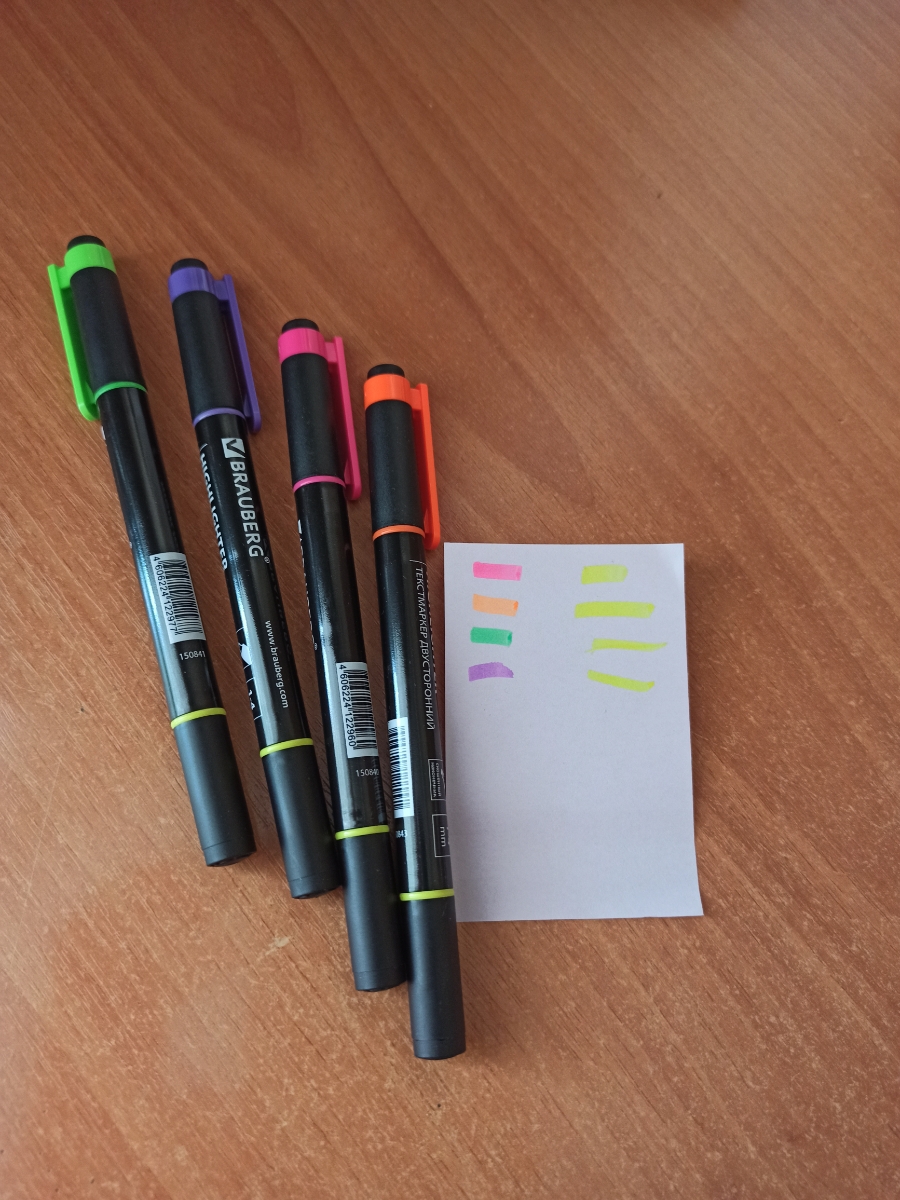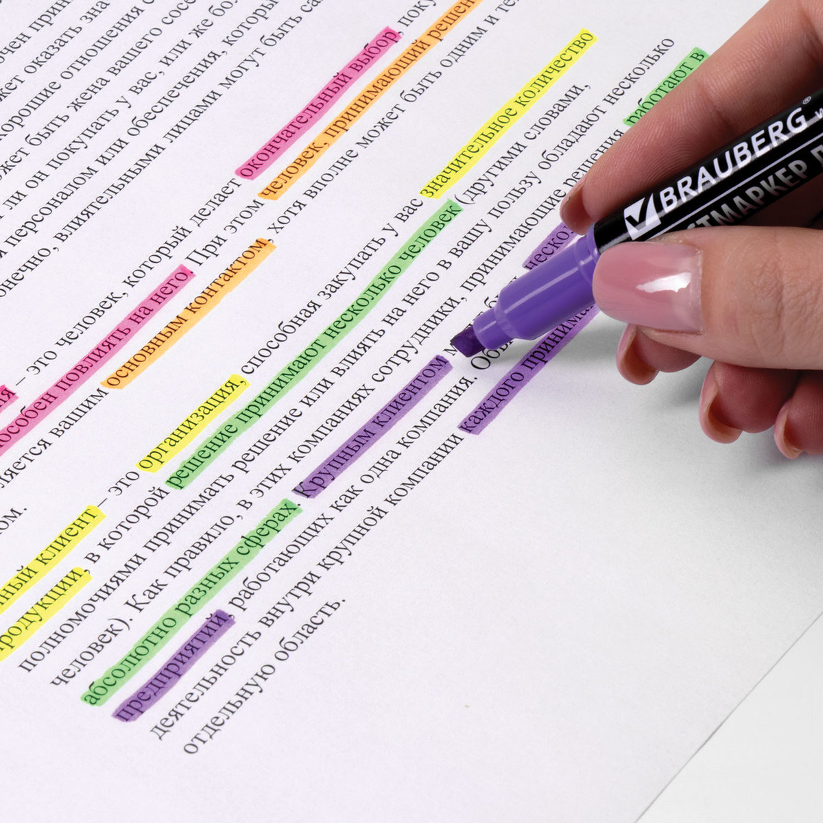 Текстовыделители BRAUBERG предназначены для выделения текста на бумаге любого типа, включая факс-бумагу.В наборе 4 двусторонних текстовыделителя неоновых цветов: желтый/зеленый, желтый/фиолетовый, желтый/розовый, желтый/оранжевый. Круглая форма корпуса ди