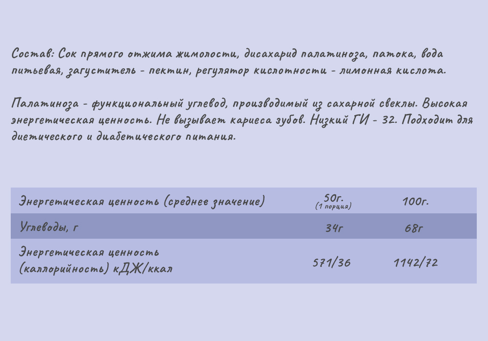 Условия хранения:Температура хранения от +15°С до +25°С и относительной влажности не более 75%Состав:Сок прямого отжима жимолости, дисахарид палатиноза, патока, вода питьевая, загуститель - пектин, регулятор кислотности - лимонная кислота.Комплектаци