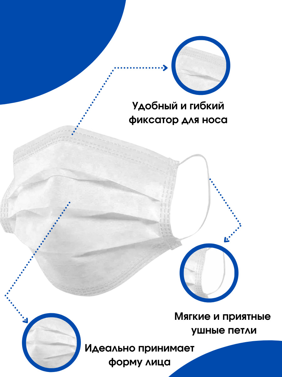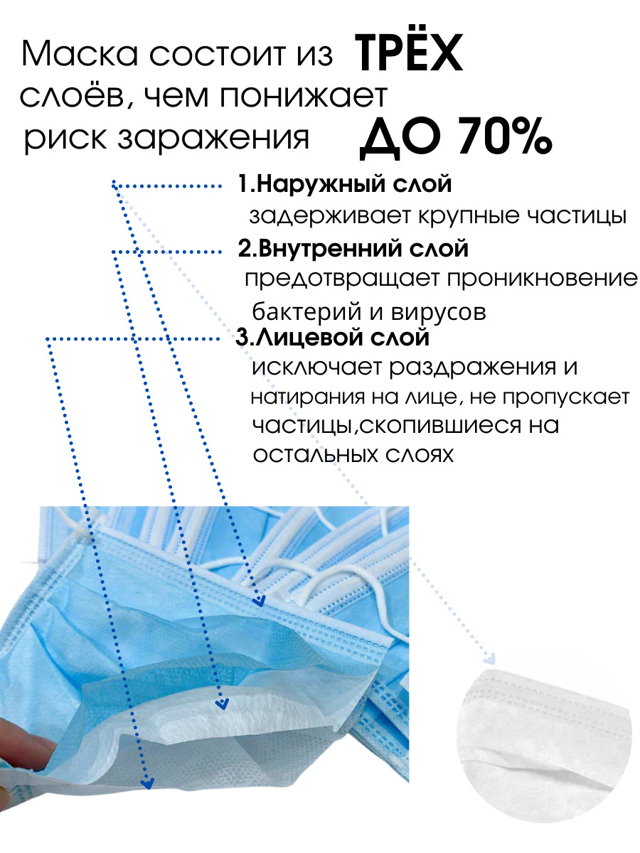 Маски медицинские 3-х слойные с высокими фильтрационными и барьерными свойствами, повышенной водонепроницаемостью и одновременной воздухопроходимостью благодаря использованию мягкого и эластичного полимерного материала с увеличенной плотностью, который пр