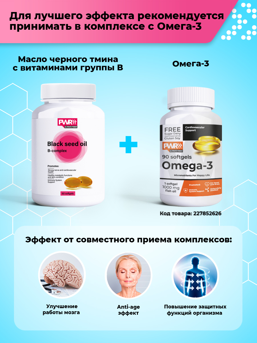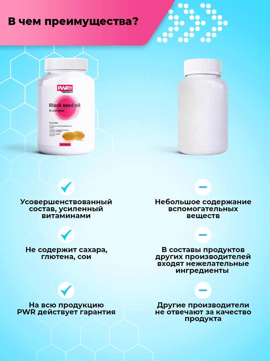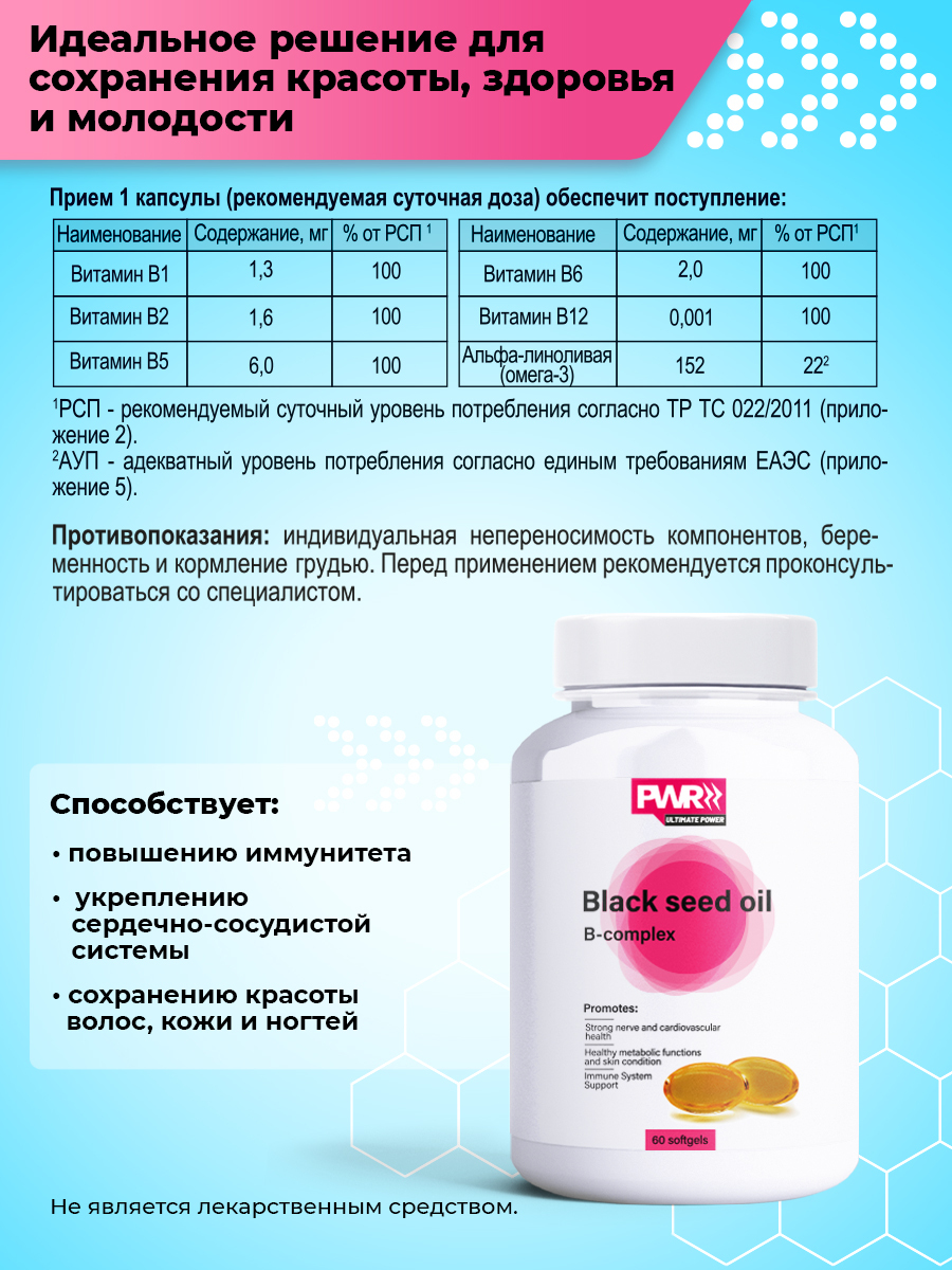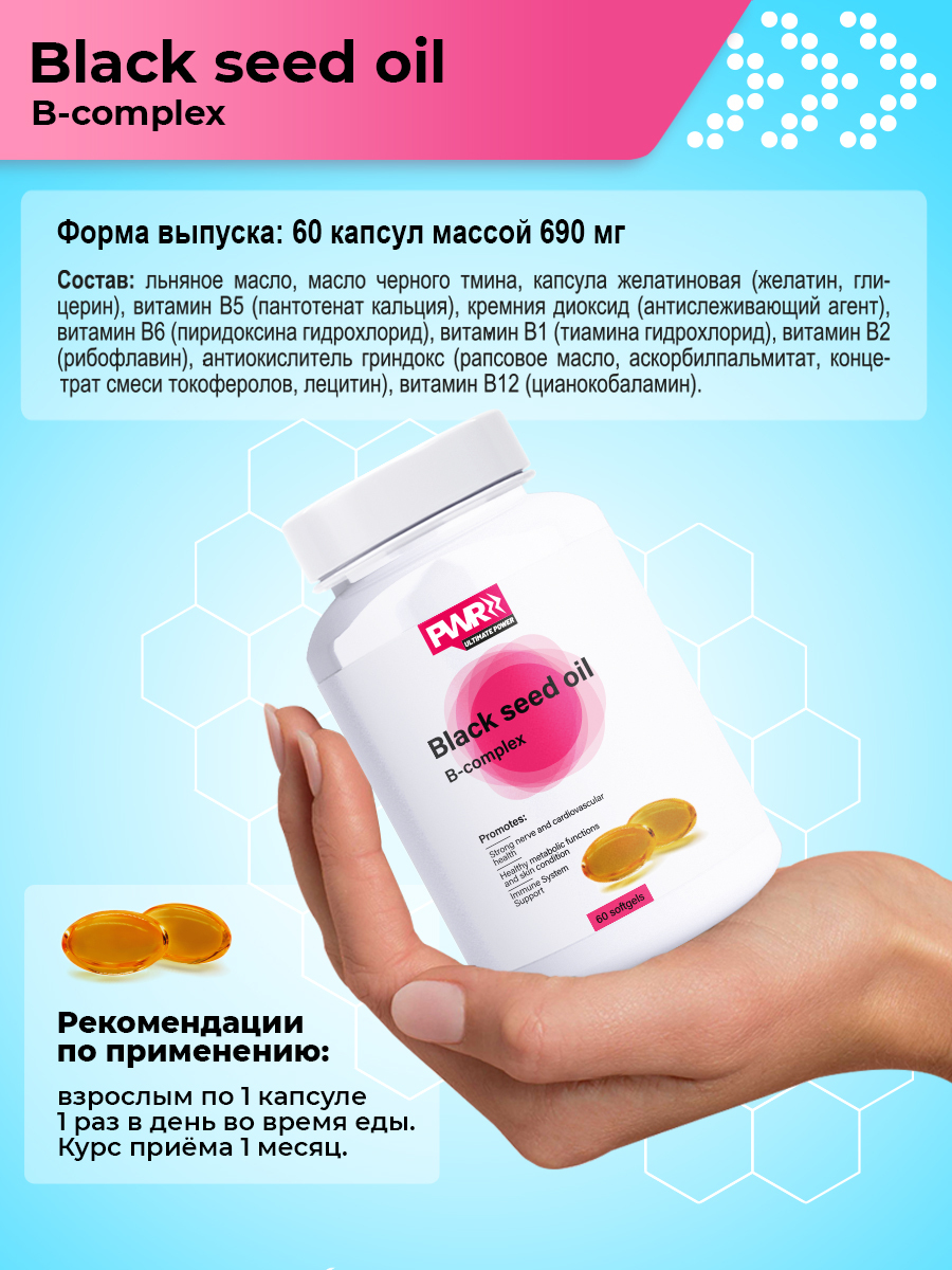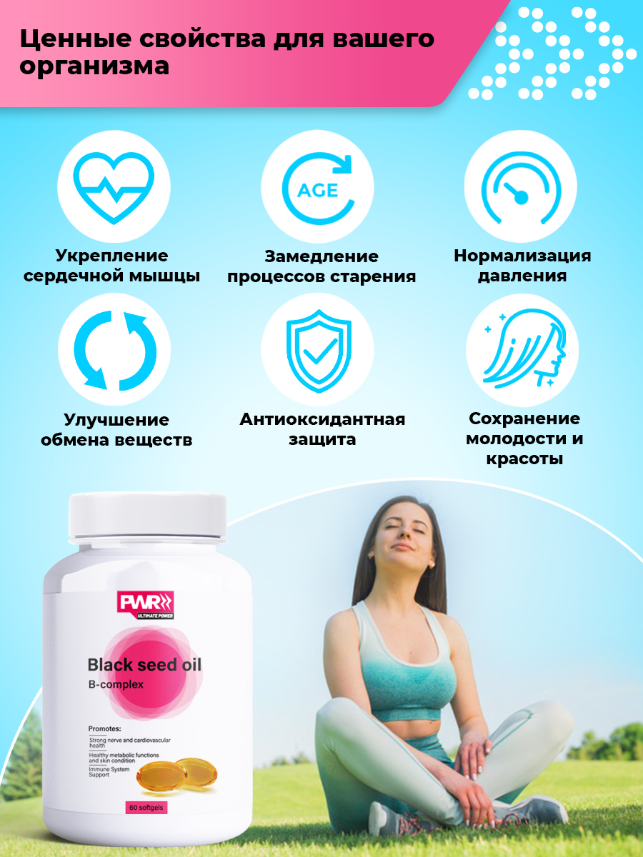 Как оставаться активным в течение дня? Всё просто! Витамины В1, В2, В5, В6, В12, альфа-линоленовые кислоты (Омега-3) - то, что тебе необходимо! И всё это содержит биологически активная добавка к пище "Масло чёрного тмина с витаминами группы B" от PWR ulti