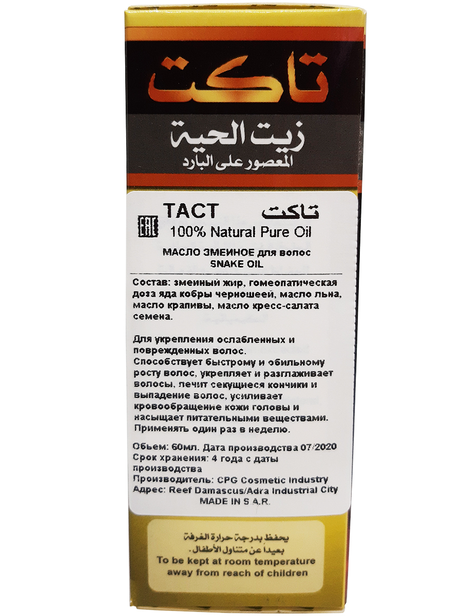Состав:змеиный жир, гомеопатическая доза яда кобры черношеей, масло льна, масло крапивы, масло кресс-салата семена.Описание:Для укрепления ослабленных и поврежденных волос. Способствует быстрому и обильному росту волос, укрепляет и разглаживает волосы, ле