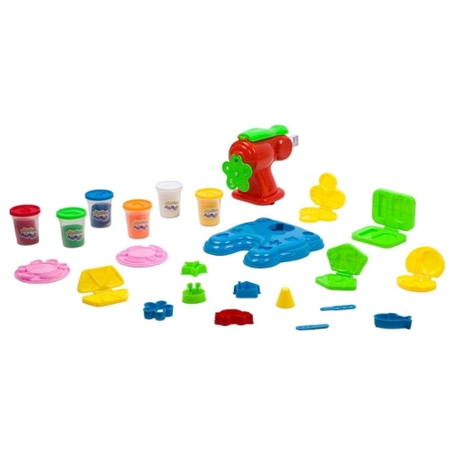 Подробная комплектация- масса для лепки: 6 баночек; - пресс-машина; - форма-трафарет; - 5 форм; - 6 формочек для печенья; - стаканчик для мороженого; - 2 тарелки для фигурного формирования.