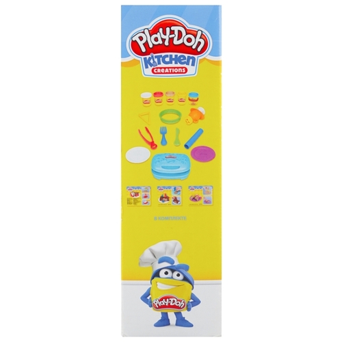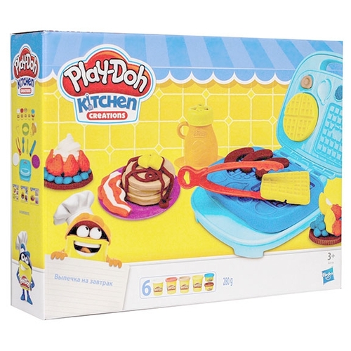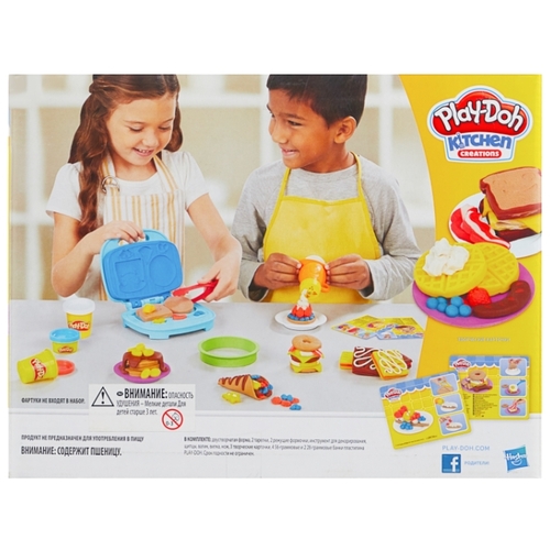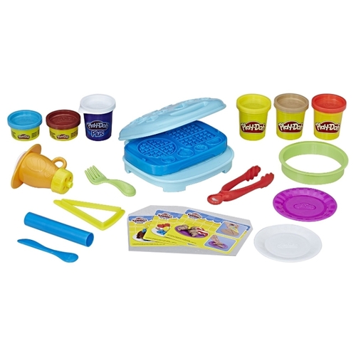 Подробная комплектациявафельница, аксессуары, 6 баночек пластилина Play-Doh (коричневый, голубой, жёлтый, красный, бежевый, белый)