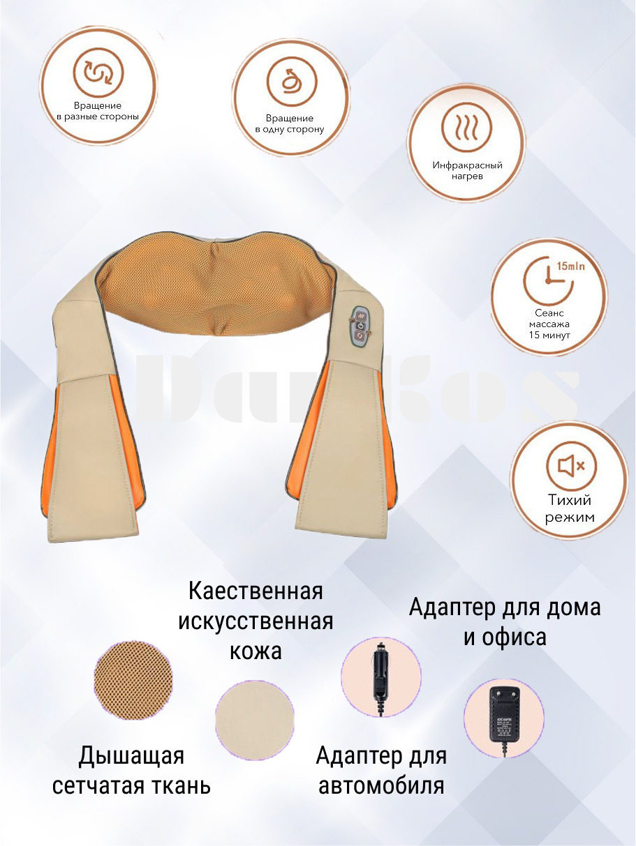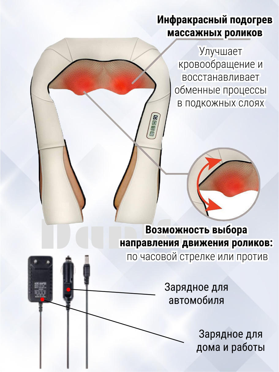 Новейшая модель массажера для шеи, плеч, спины, ног и стоп оснащен подогревом массажных роликов.12 массажных роликов.Управление обогревом.2 направления массажа.3 скорости вращения массажных роликов.Автоматическое отключение через 15 минут.Питание от домаш