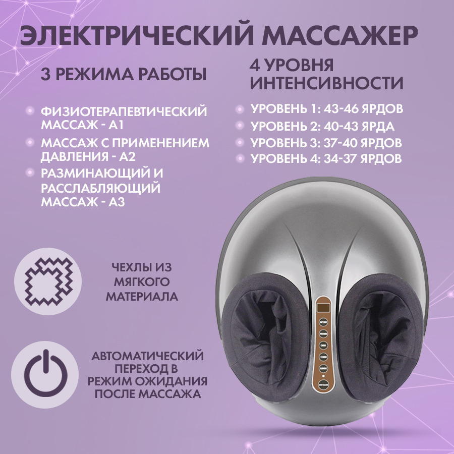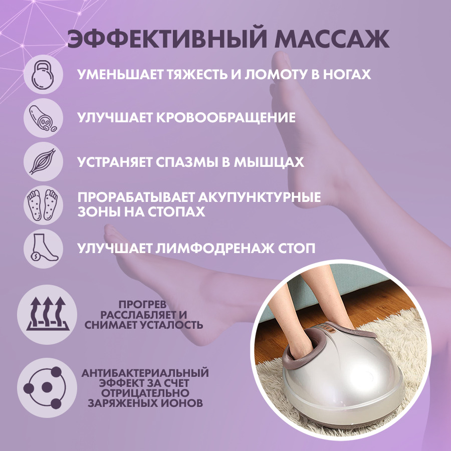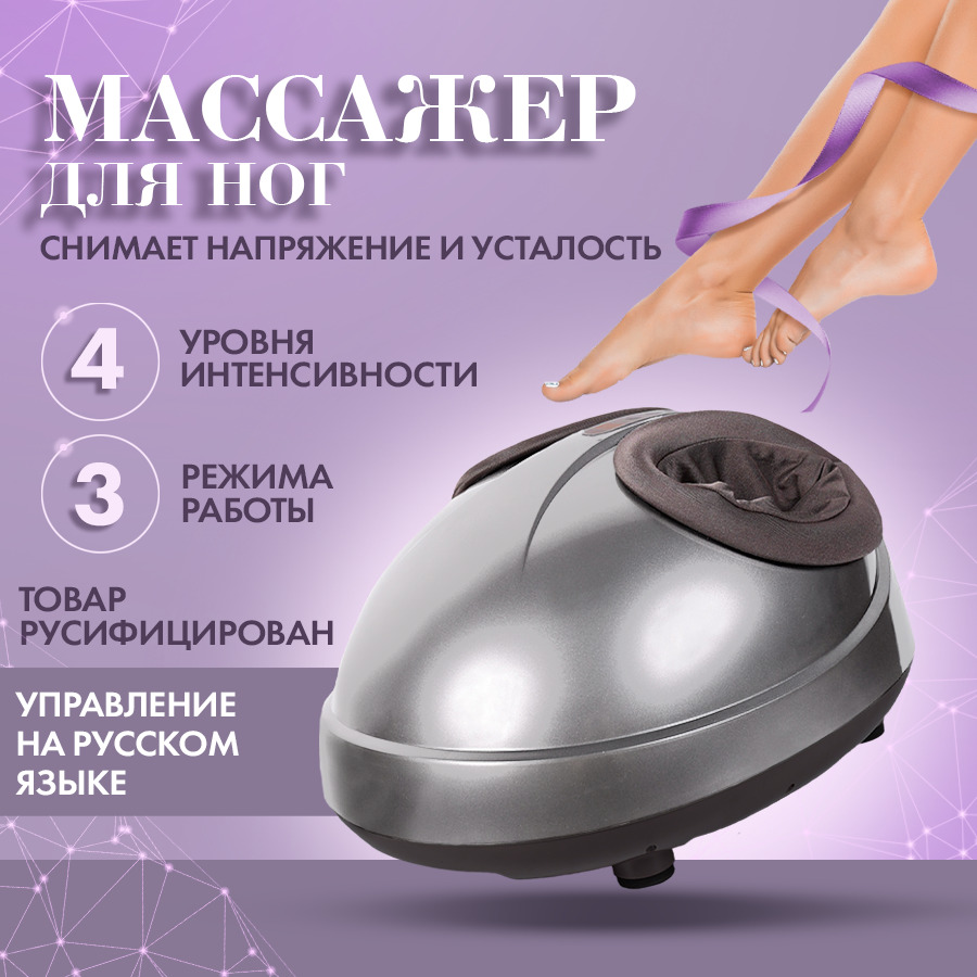 Комплектация:Массажер для ног - 1 шт.Адаптер для сети 220В.Инструкция на русском языке.Описание:Мощный многофункциональный универсальный массажер для ног позволяет одновременно и полностью разминать стопы, лодыжки, икроножные мышцы и голеностоп, избавляя