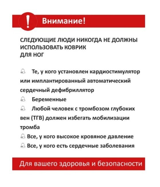Способ примененияВстаньте обеими ногами на массажный коврик. Нажмите на кнопку включения ON. Выберите подходящий вам режим, нажав на кнопку PROGRAM. Во время массажа при необходимости увеличивайте или уменьшайте интенсивность с помощью кнопок INO и DEC.