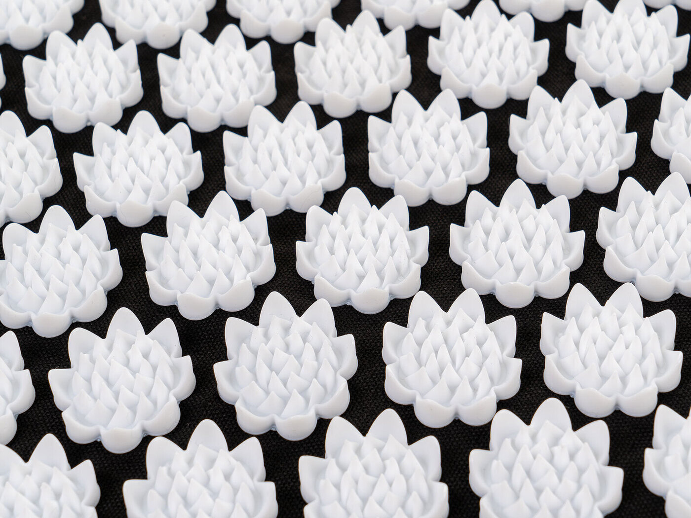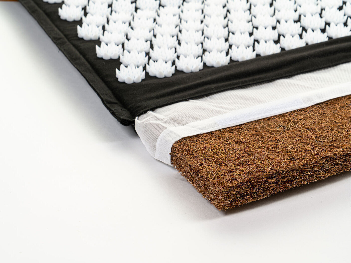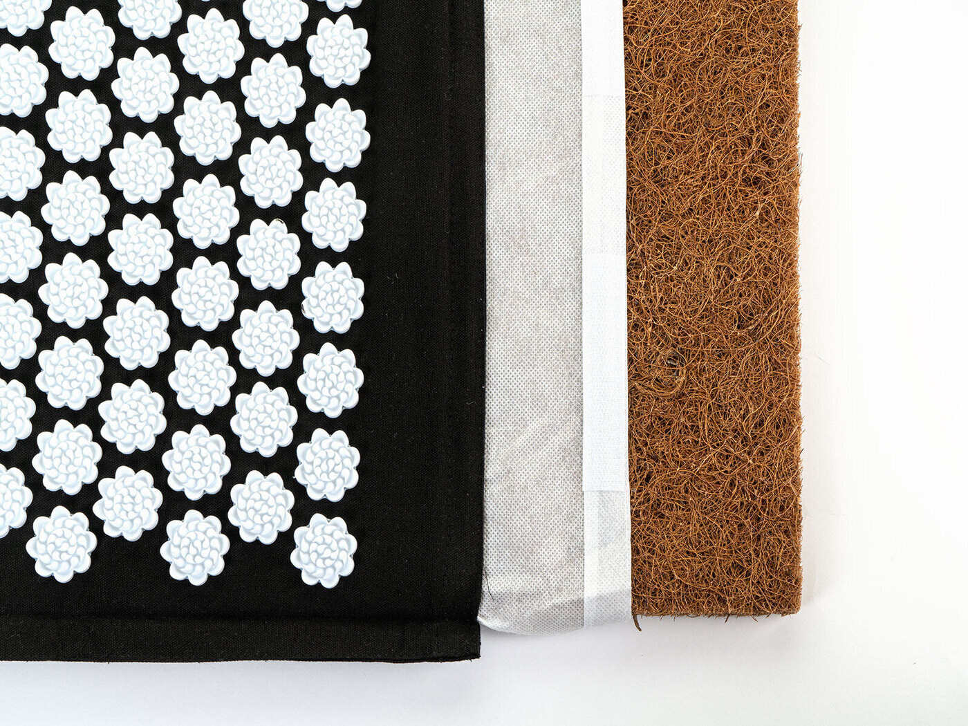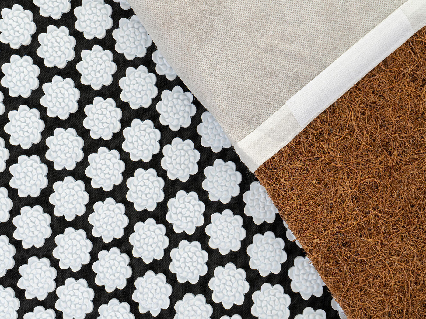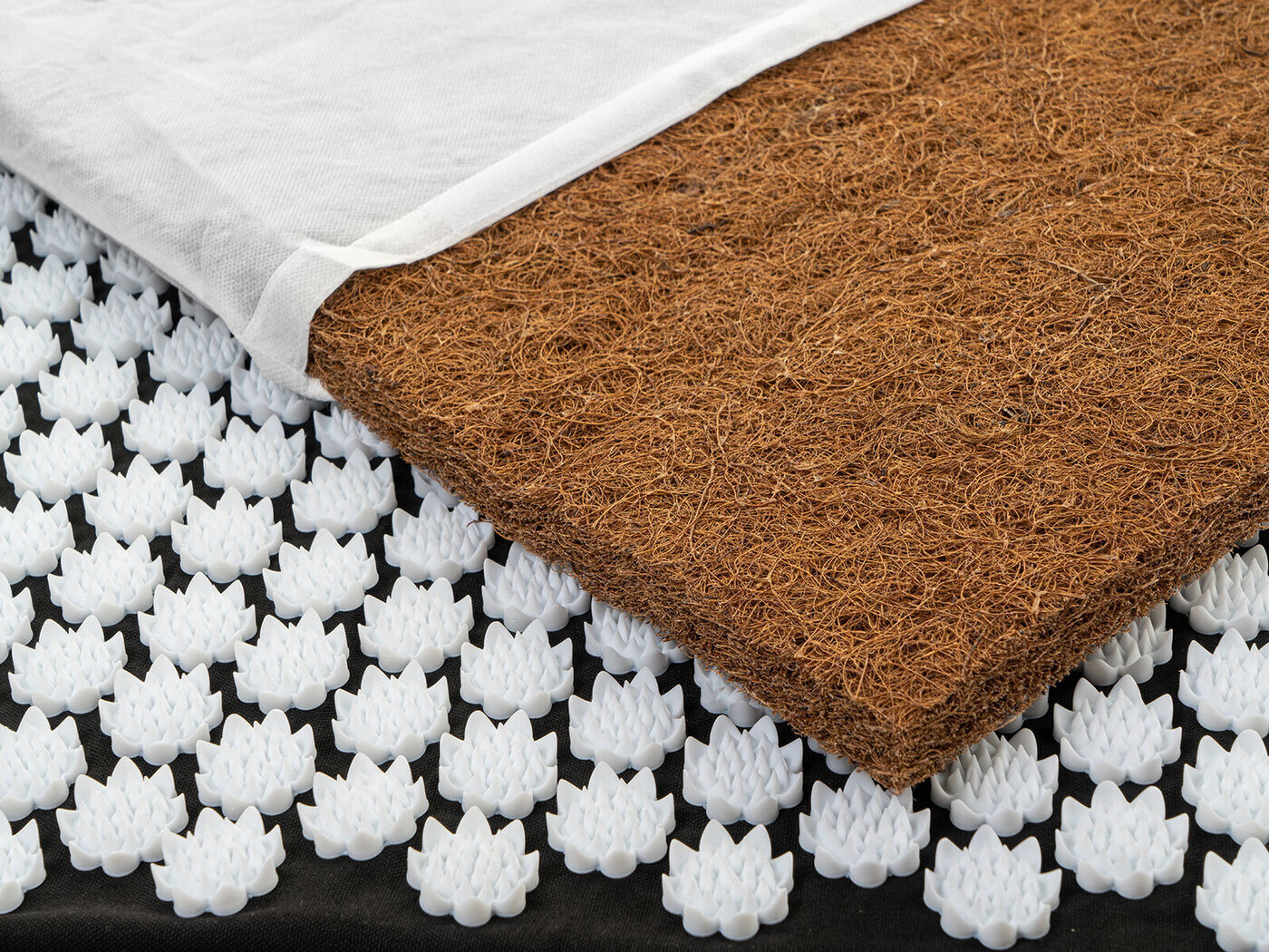 Массажный коврик 67х39х3 см, изготовленный из хлопка с натуральным наполнителем из кокосового волокна, массажные аппликаторы в форме лилии изготовлены из медицинского пластика H.I.P.S.Акупунктурный коврик, снаружи который покрыт массажными элементами. Так