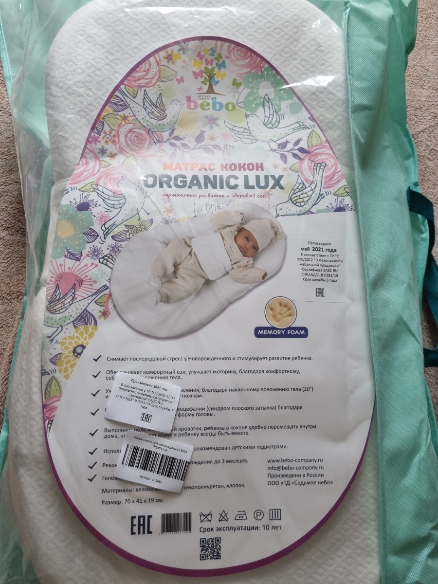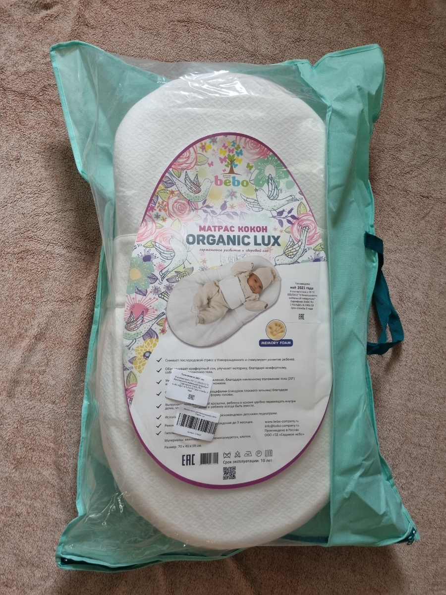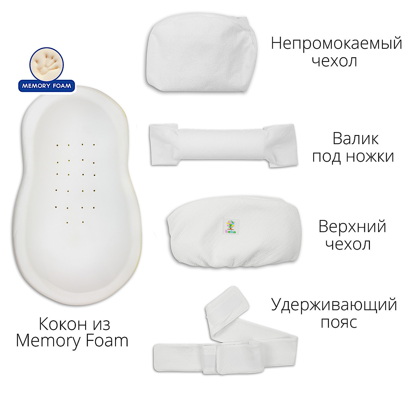 Комплектация:Кокон-матрасик из высокоэластичной пены нового поколения Memory Foam.Влагостойкий, водоотталкивающий чехол.Валик, позволяющий регулировать размер колыбельки под рост малыша, приподнимая его ножки.Наволочка из нежнейшего хлопка.Специальный шир