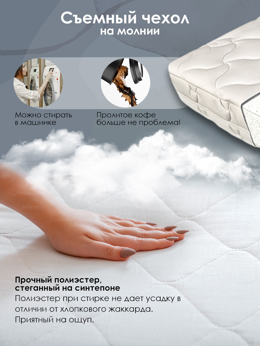 Особенности матрасаАнтистатическое покрытие, Гипоаллергенный наполнитель, Стеганое покрытие, Бесклеевой, Эффект памяти, Съемный чехол