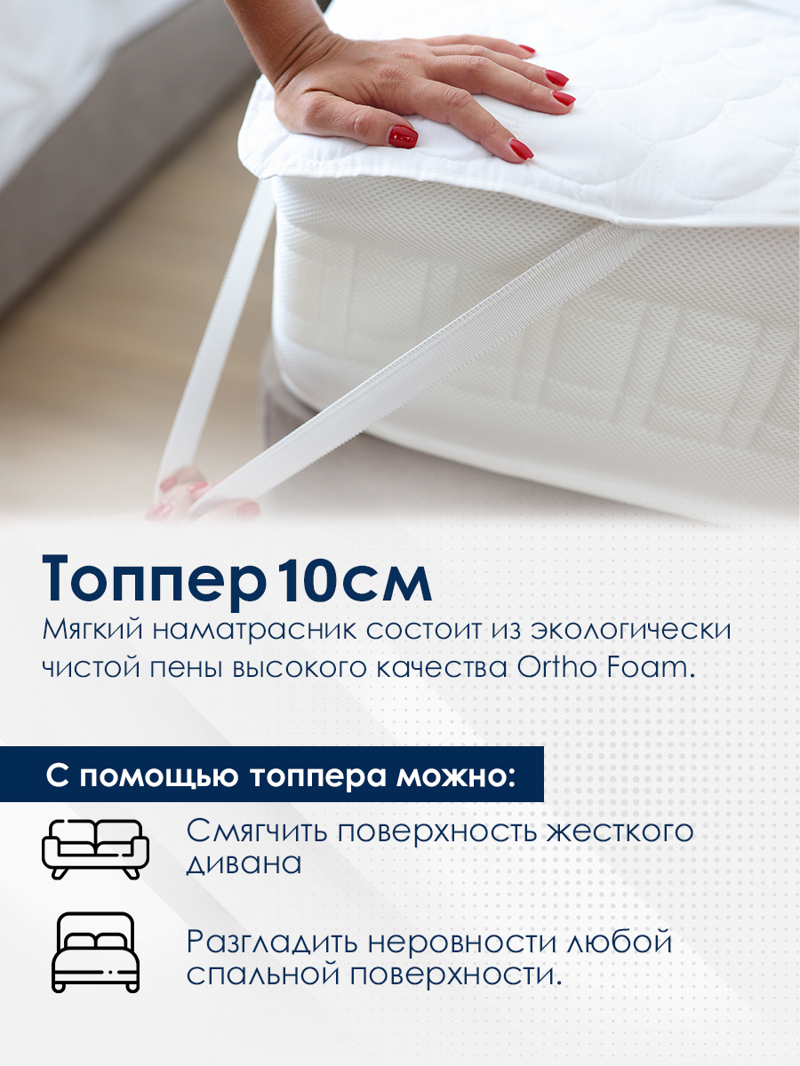 Дополнительно:Матрасы для кровати / Матрас беспружинный / Топпер - это синоним к диванному матрасу. Данный вид ортопедического изделия не сможет полноценно заменить матрас, но имеет ряд неоспоримых преимуществ: Защита поверхности спального места от появле