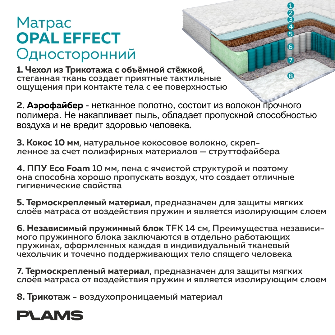 Как купить матрас с хорошими характеристиками недорого? Выберите одностороннюю модель, такую как Plams OPAL EFFECT.Изделие имеет среднюю жёсткость и высоту 17 см. Подойдёт для людей, чей вес не превышает 120 кг.На нём удобно спать вдвоём, даже если вы име