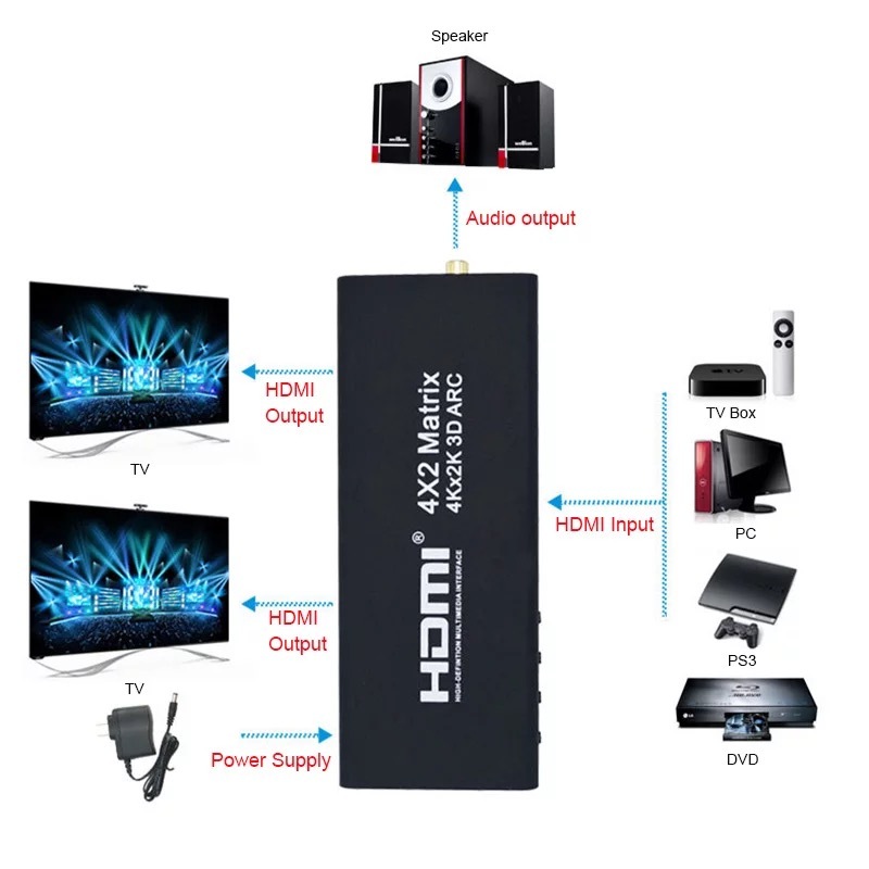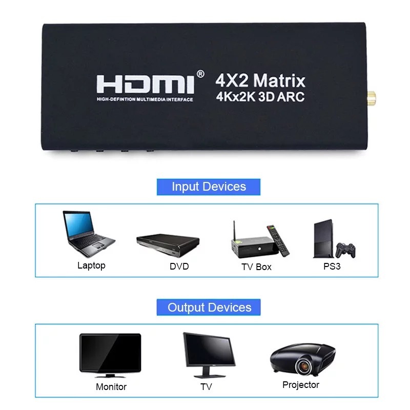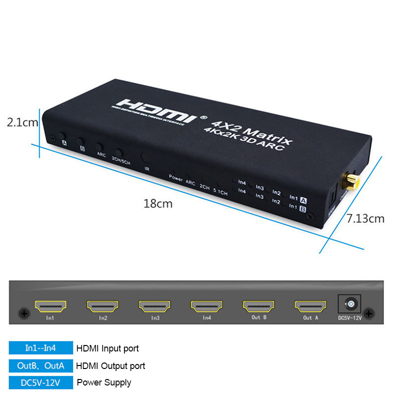 Комплектация:1.HD матрица2. ИК-пульт дистанционного управления(Без аккумулятора)3. 5 V адаптер питания4. Руководство пользователяОписание:Поддержка HD 1.4bПоддержка формата 3D видеоПоддержка наивысшего разрешения до 4096*2160/30 ГцПоддержка 3,2G скоростну