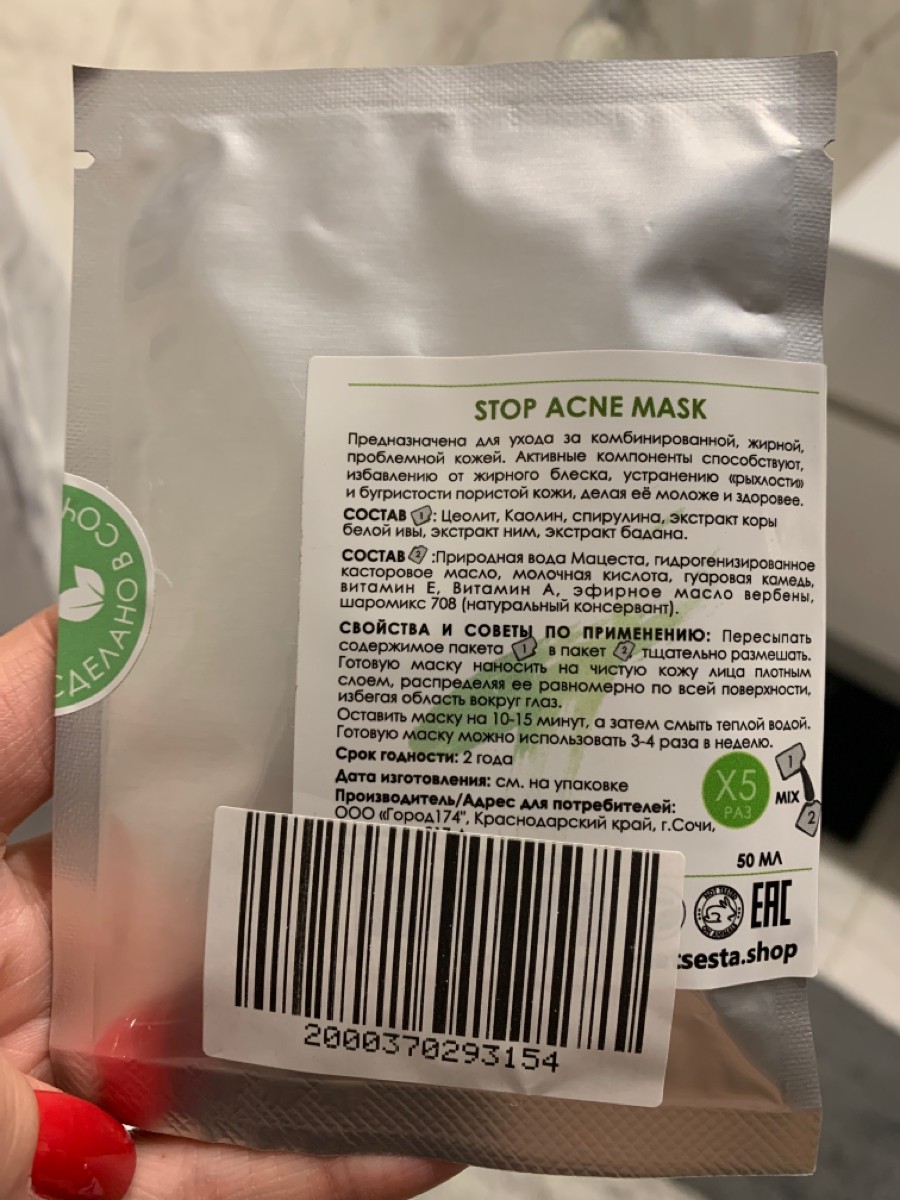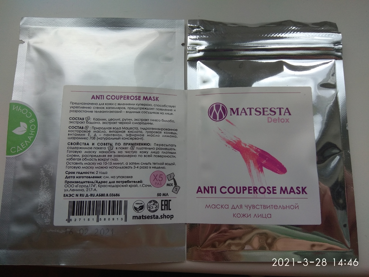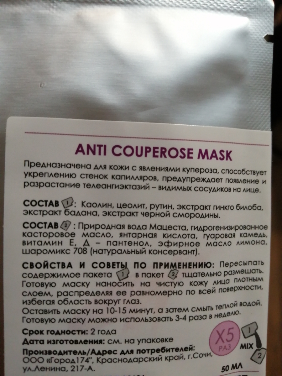 Способ применения:Пересыпать содержимое пакета №1 в пакет №2, тщательно размешать. Готовую маску наносить на чистую кожу лица плотным слоем, распределяя ее равномерно по всей поверхности, избегая область вокруг глаз. Оставить маску на 10-15 минут, а затем