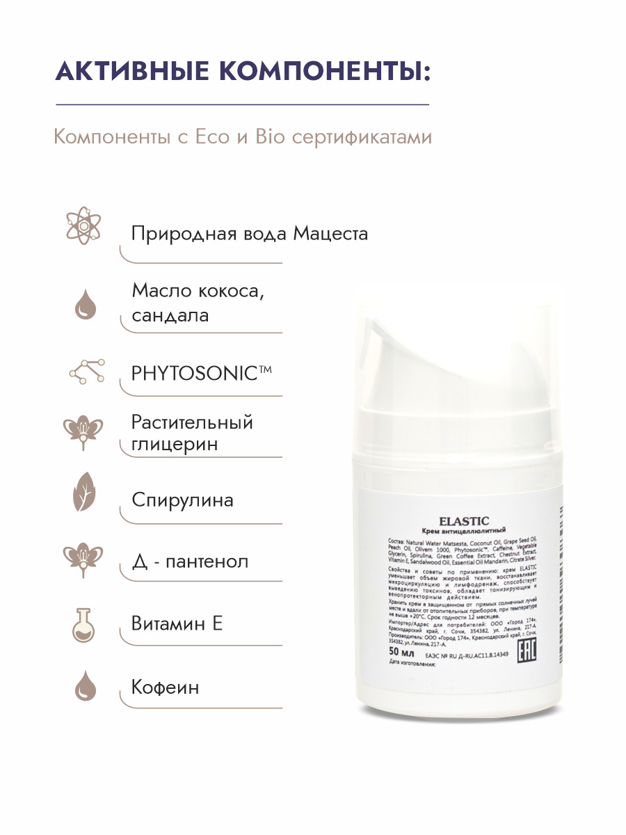 Состав:Природная вода МацестаМасло кокосовоеОливем 1000 (получен из оливкового масла)PHYTOSONIC™Растительный глицеринКофеинМасло персиковоеЭкстракт зеленого кофеМасло сандалаСпирулинаВитамин ЕЭфирное масло мандаринаЦитрат серебра (лимонная кислота, соедин
