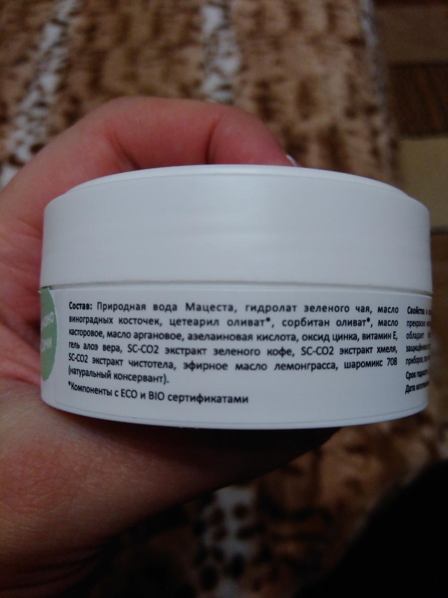 Способ применения:Массируя, нанесите небольшое количество крема на чистую кожу.Состав:Природная вода Мацеста, гидролат зеленого чая, масло виноградных косточек,цетеарил оливат*, сорбитан оливат*, масло касторовое, масло аргановое, азелаиновая кислота, окс