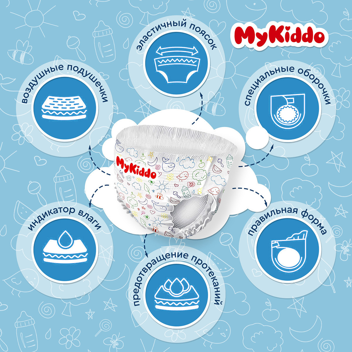 Способ применения:У данных подгузников трусиков есть передняя и задняя сторона. Выбрав нужную сторону и растянув трусики с обеих сторон, оденьте на ребенка. Подтяните трусики до уровня пупка. Проверьте, чтобы в районе бедер не образовалось щелей. Убедитес