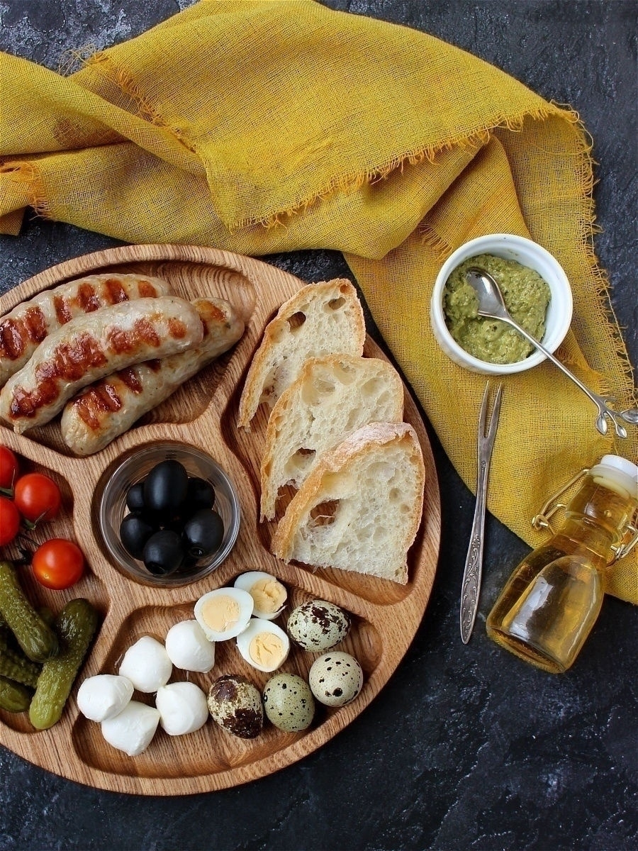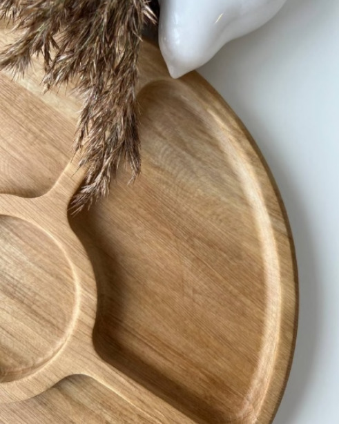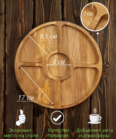 Круглая деревянная менажница из натурального бука на 5 ячеек. Изделие для сервировки стола не только придает дому особый уют, но и радует владельца своей многофункциональностью: оборотная сторона изделия выступает как разделочная доска для пищевых продукт