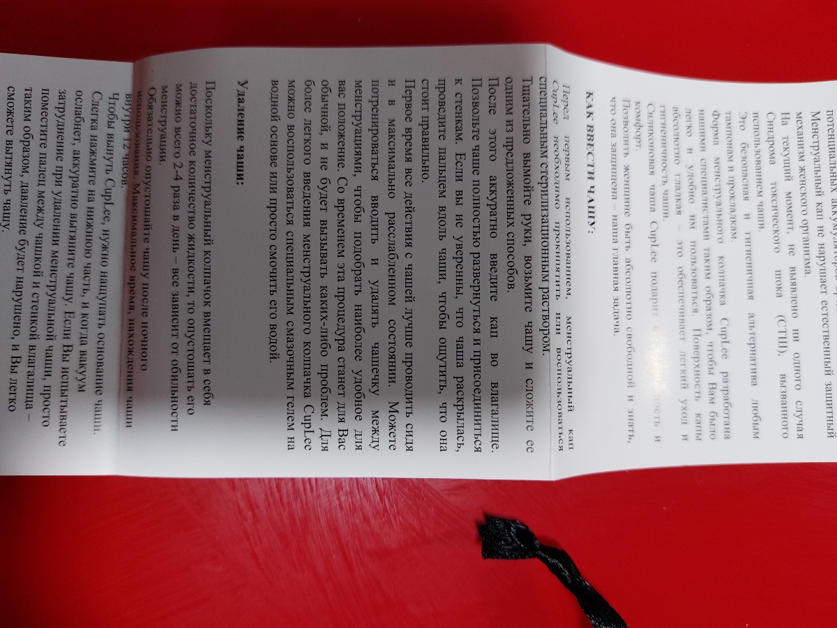 Комплектация:Менструальная чаша CupLee + льняной мешочек + инструкцияОписание:Уникальное многоразовое средство интимной гигиены – Менструальные чаши CupLee.Размер L - диаметр чаши 43мм, объем 25мл.(для средних и обильных выделений или рожавшим)Размер S -