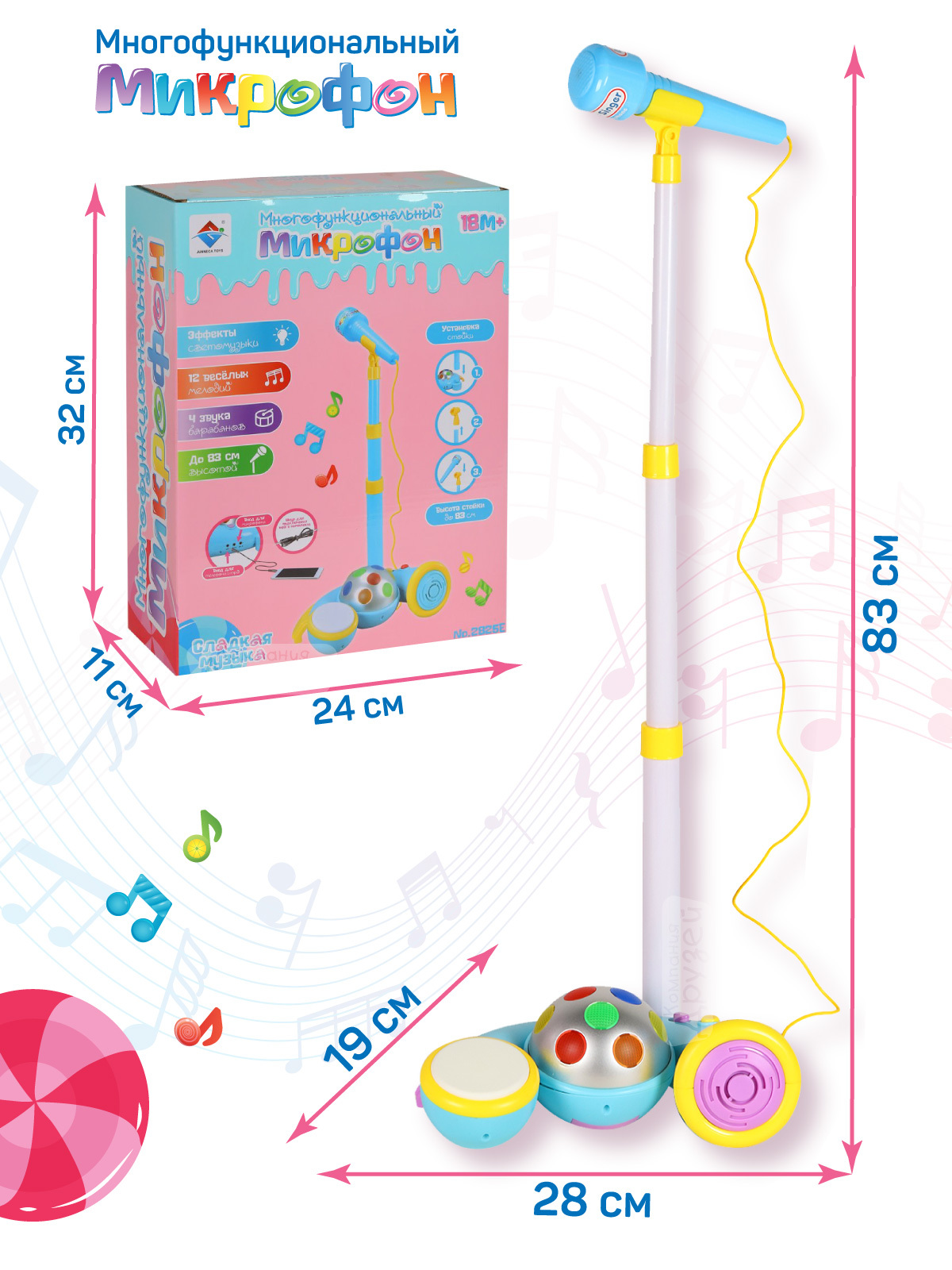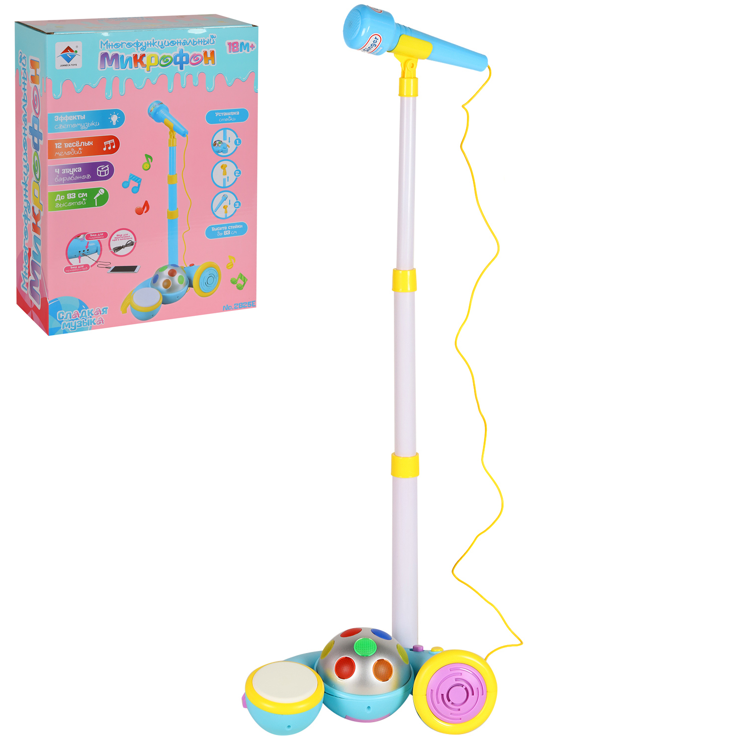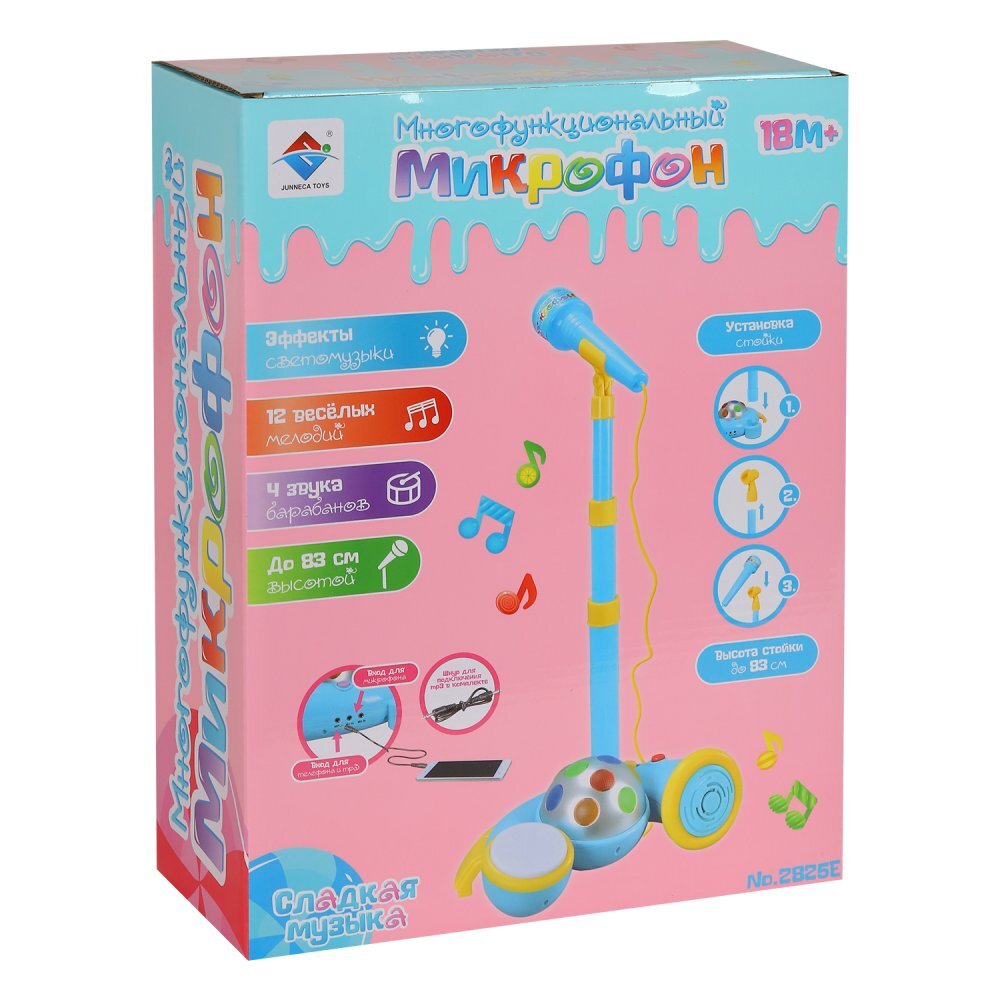 Многофункциональный детский микрофон понравится детям. Яркая расцветка развлечет малыша. Имеются барабаны, встроенные мелодии, светомузыка. Теперь можно устроить дома настоящий концерт.У микрофона есть эффекты светомузыки, 12 веселых мелодий, 4 звука бара