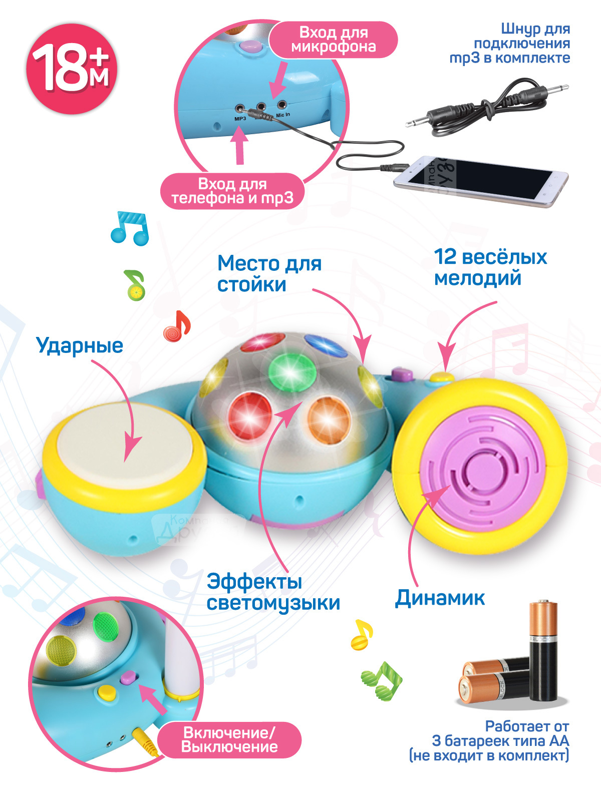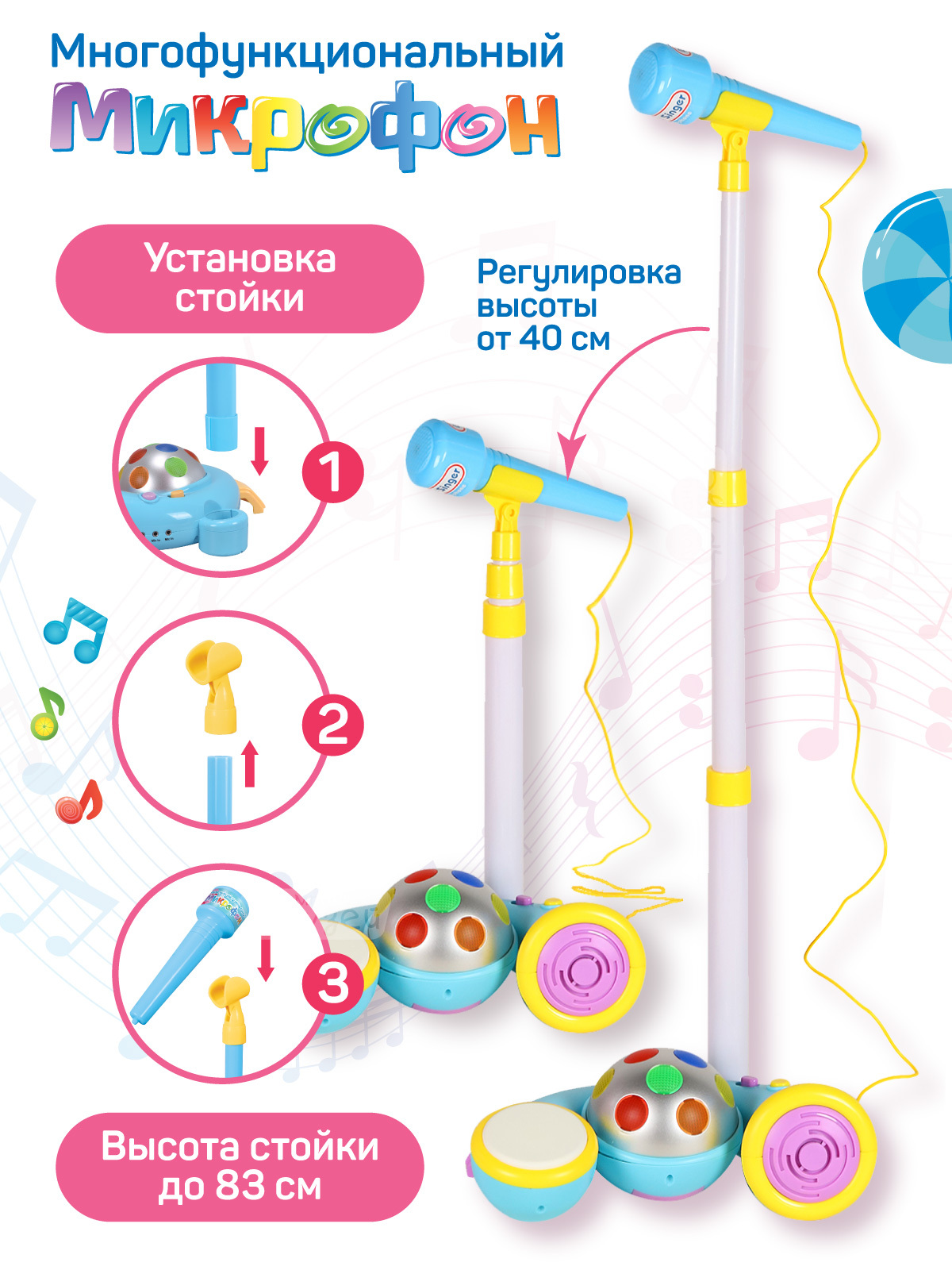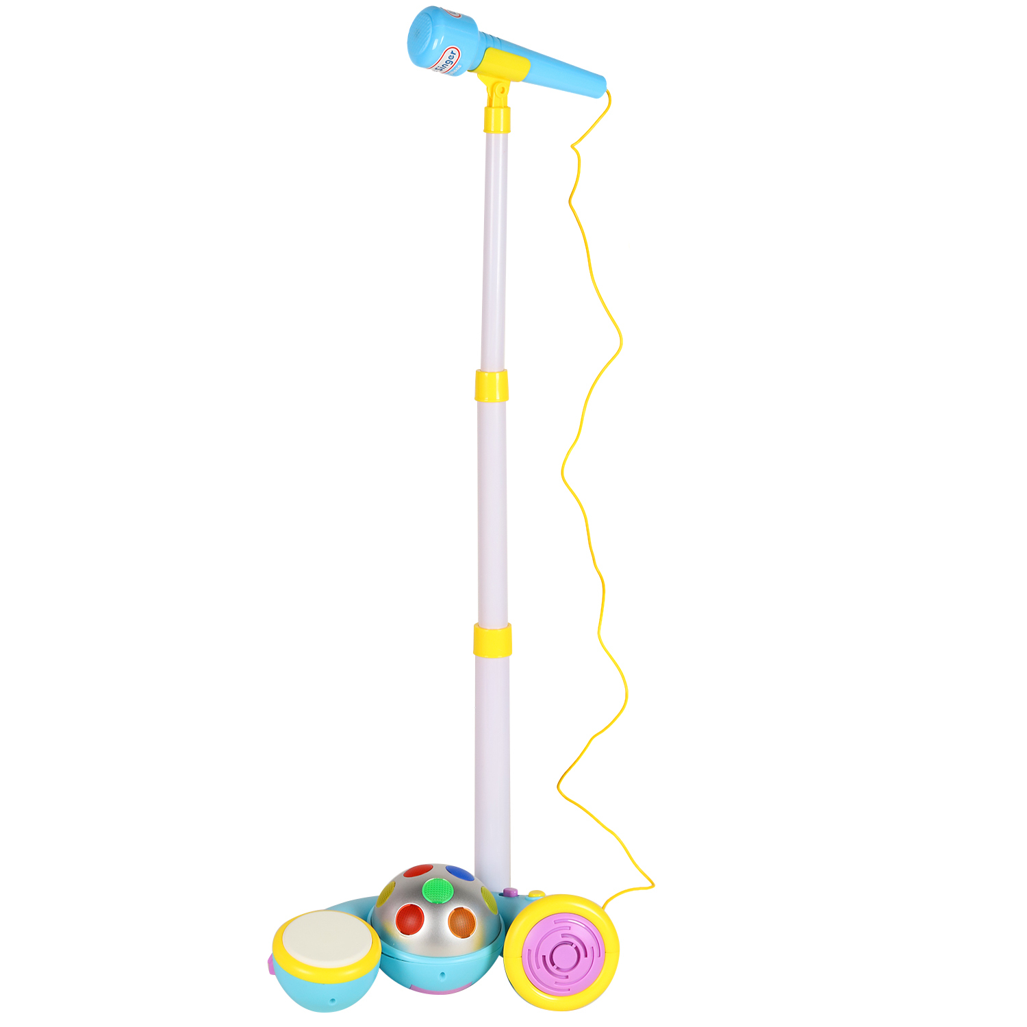 Многофункциональный детский микрофон понравится детям. Яркая расцветка развлечет малыша. Имеются барабаны, встроенные мелодии, светомузыка. Теперь можно устроить дома настоящий концерт.У микрофона есть эффекты светомузыки, 12 веселых мелодий, 4 звука бара