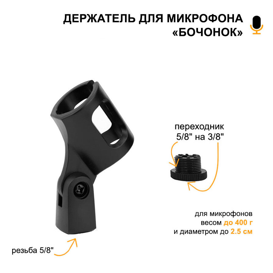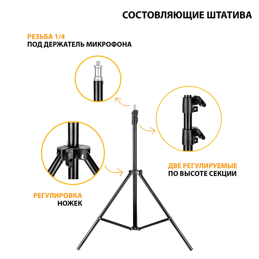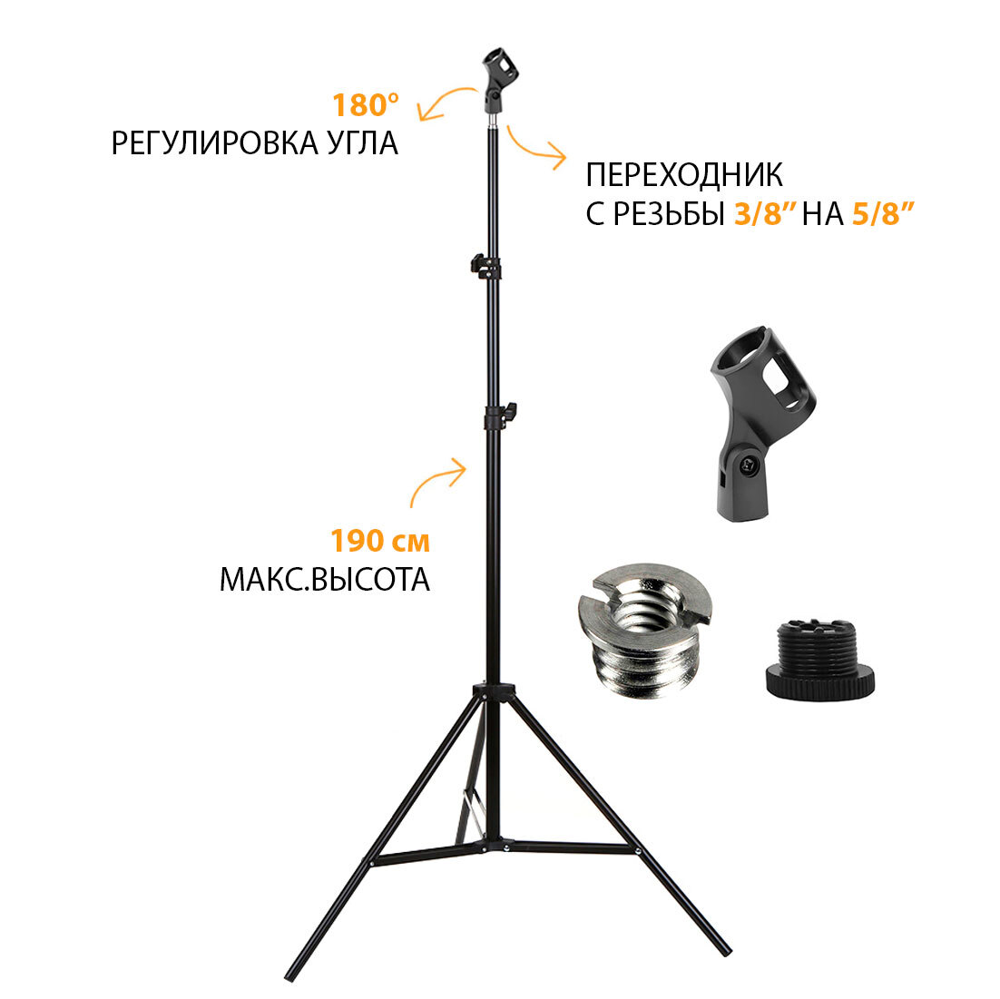 Комплектация:Штатив, держатель для микрофона, переходник 3/8"(F) - 1/4"(M)Описание:Напольный штатив с держателем для микрофона - практичная стойка для сценических и вокальных микрофонов, можно использовать в студии звукозаписи. Высота микрофонной стойки м