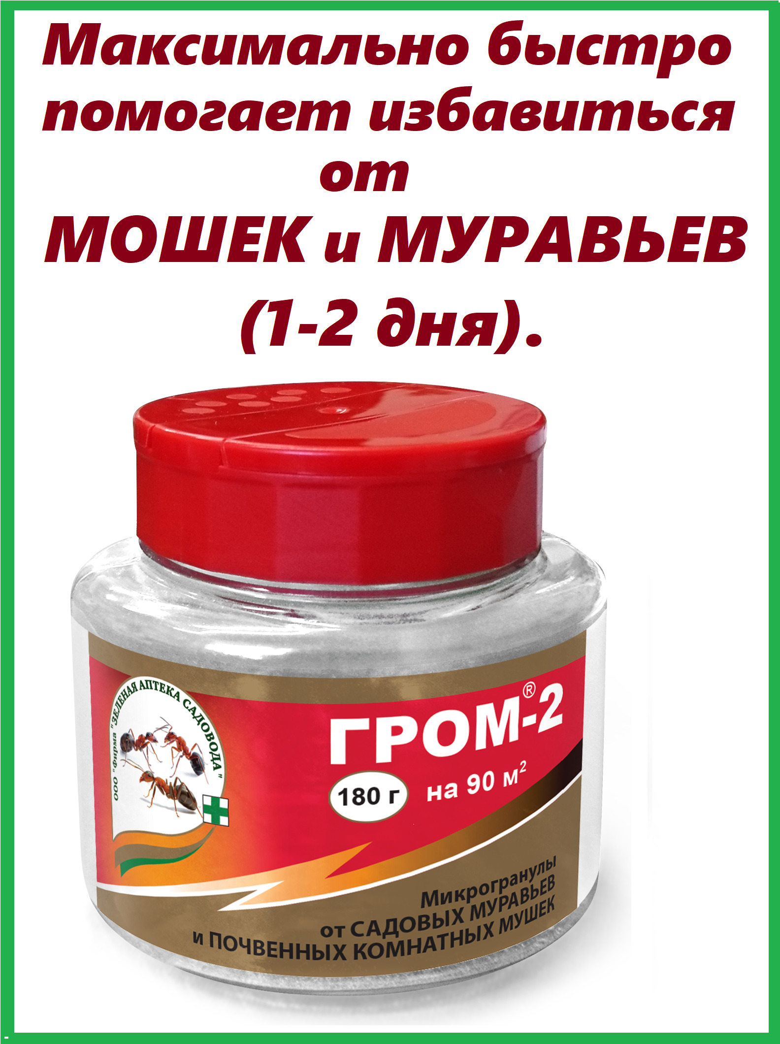 Комплектация:Микрогранулы от муравьев и мошек Гром-2 180 гр.-1 шт.Описание:ГРОМ-2 – эффективный препарат, позволяющий не только максимально быстро избавится от муравьев и почвенных мушек (1-2 дня), но и обеспечивающий длительную защиту от них (более одног