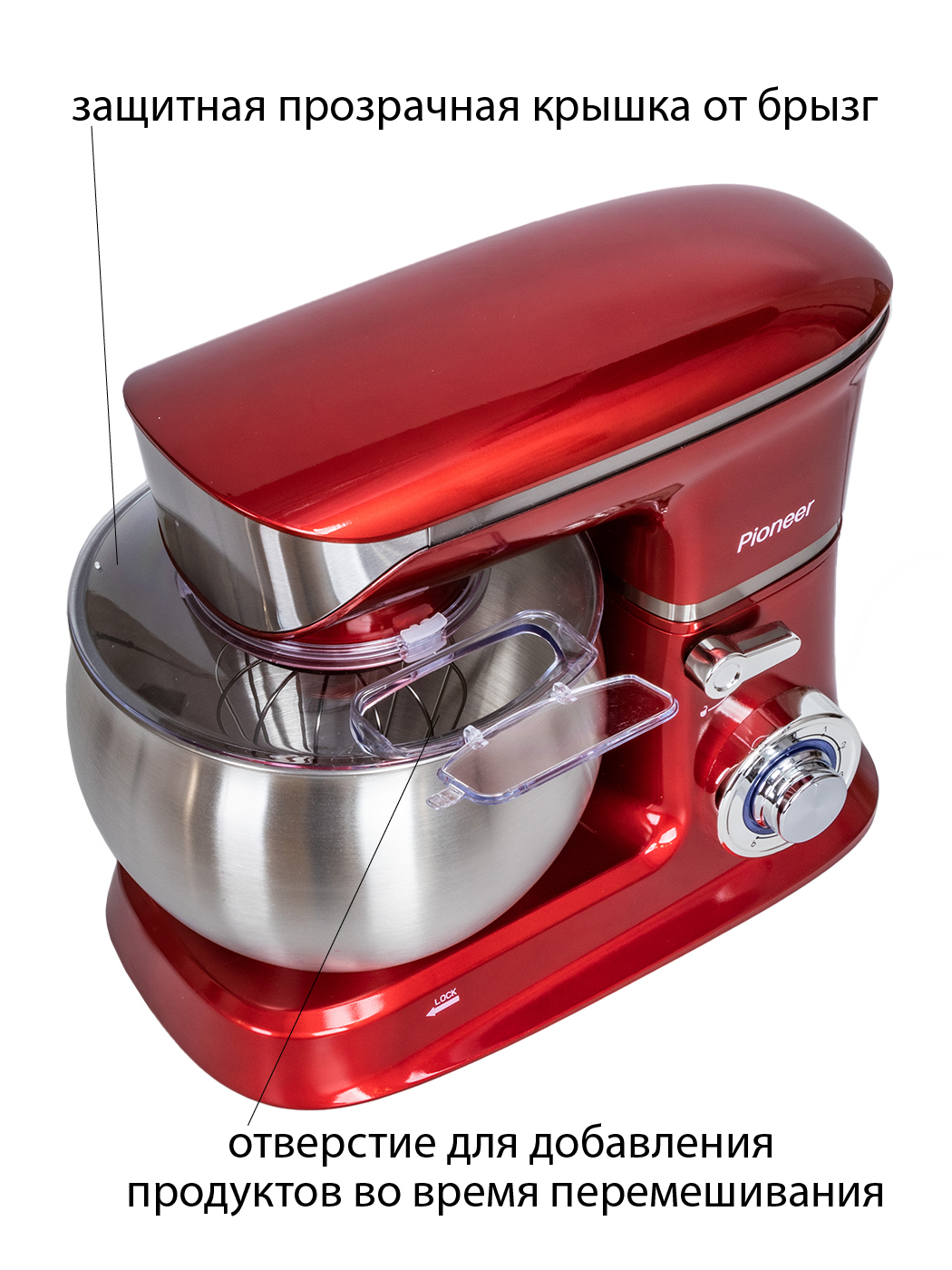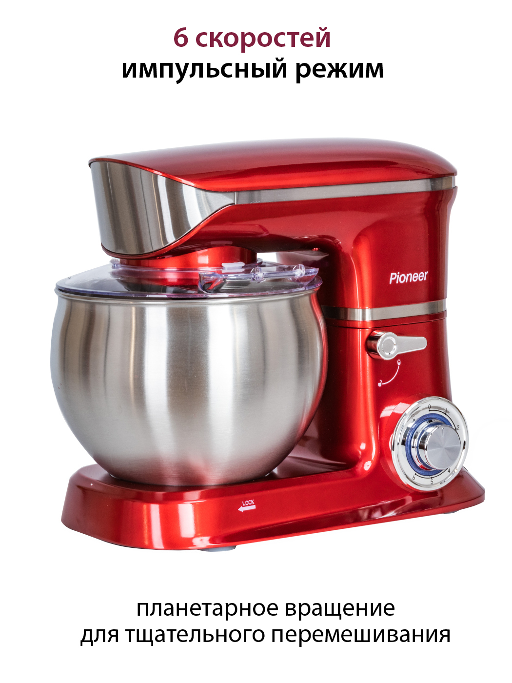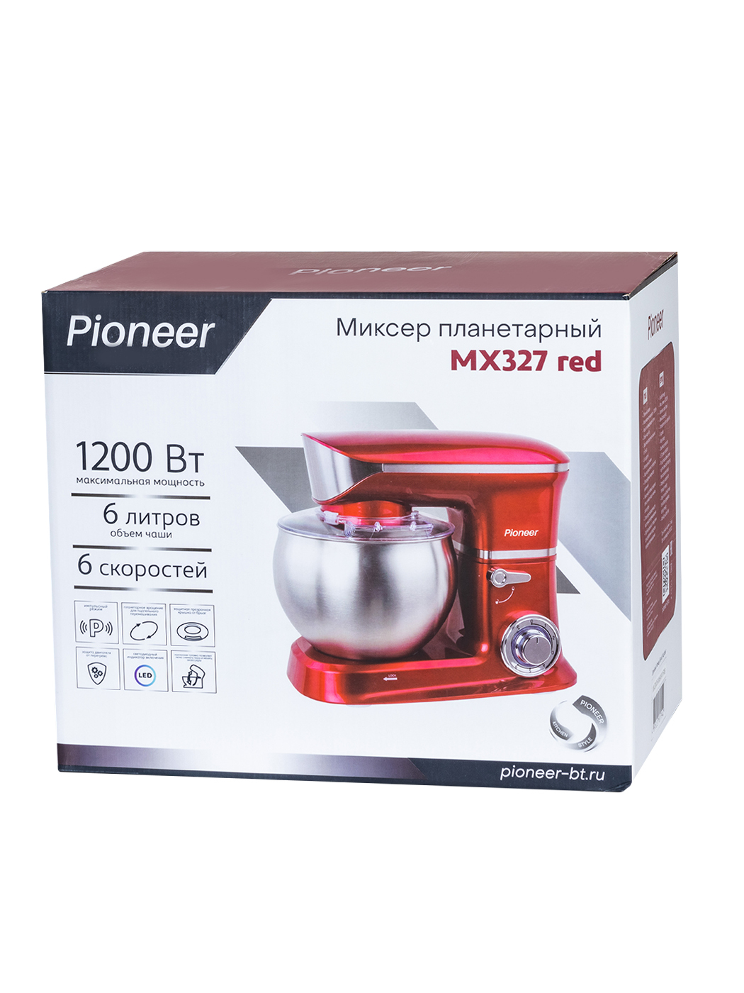 Планетарный миксер Pioneer MX327 мощностью 1200 Вт со съемной чашей объемом 6 л, выполненной из нержавеющей стали, 3 насадками и 6 скоростями представляет собой современный стационарный прибор для замеса дрожжевого и бездрожжевого теста различной вязкости