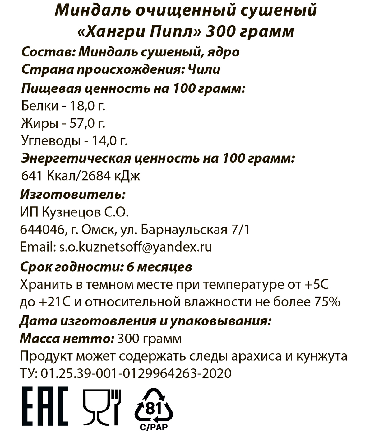 Условия хранения:Хранить в сухом темном месте при температуре от +5С до +25С и относительной влажности не более 75%Состав:Натуральный очищенный миндаль сушеный, без обжаркиОписание:Отборный натуральный миндаль (almond) без обжарки – это отличный перекус н