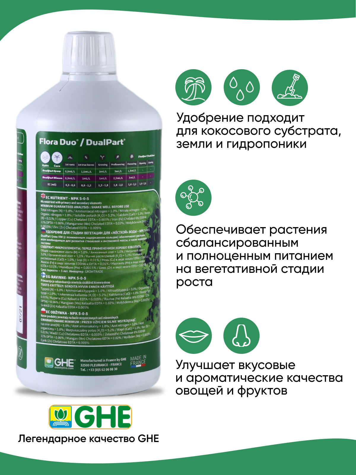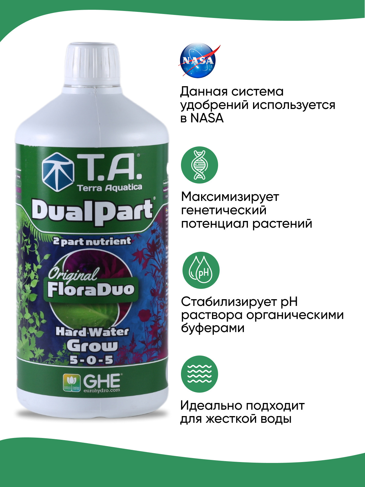 Комплектация:1 бутылка 1л.Описание:FloraDuo - прекрасное минеральное двухкомпонентное удобрение для любых видов цветущих растений. Уникальная формула содержит в себе биоактивные добавки и стимуляторы FloraDuo Grow для жесткой воды – удобрение, предназначе