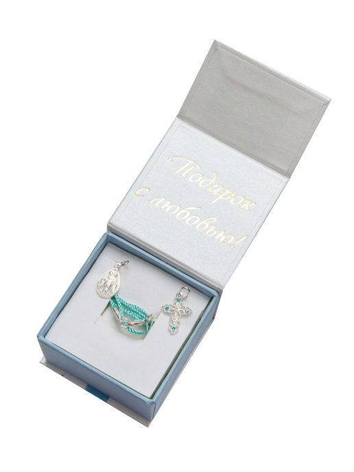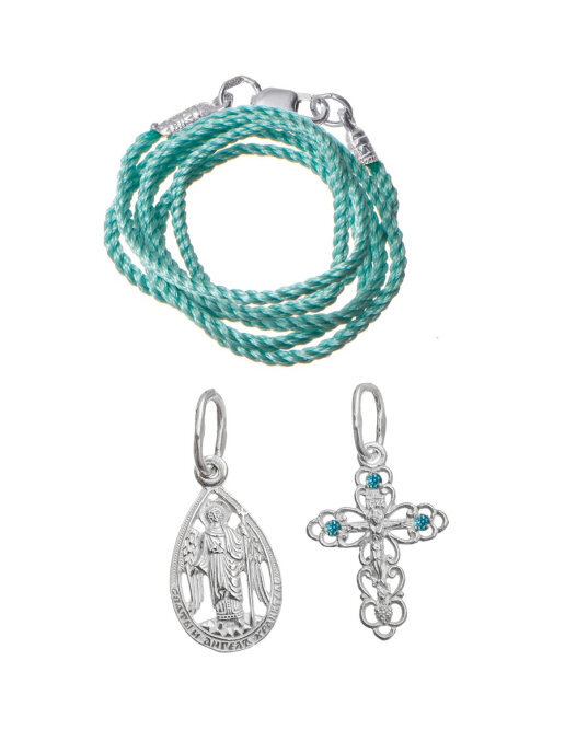 В крестильный набор входит: Крестик 21*10 мм; икона "Ангел хранитель" 21*10 мм; Веревочка 45 см. Состав: Серебро 925Комплектация:подвеска; пломба; икона; подарочная упаковка; веревка