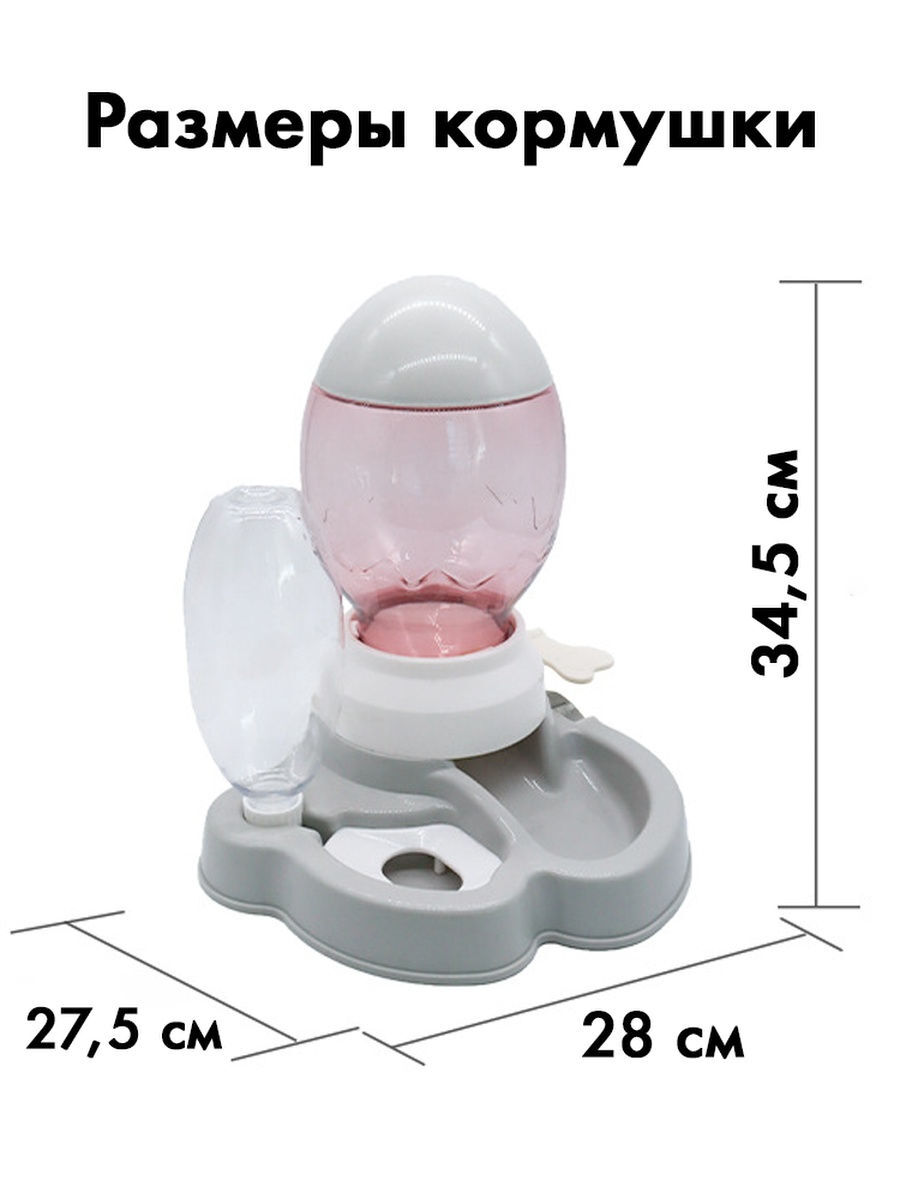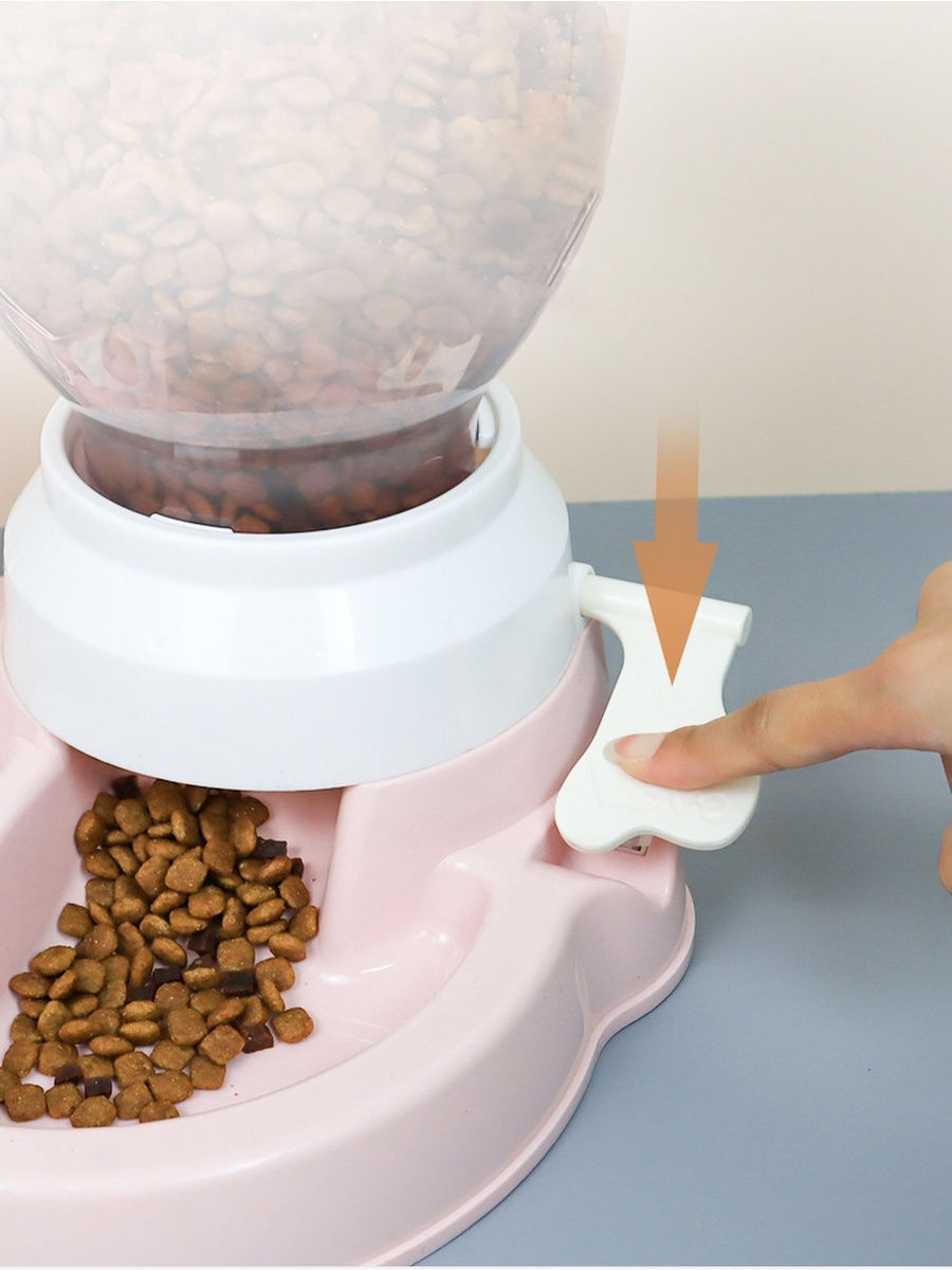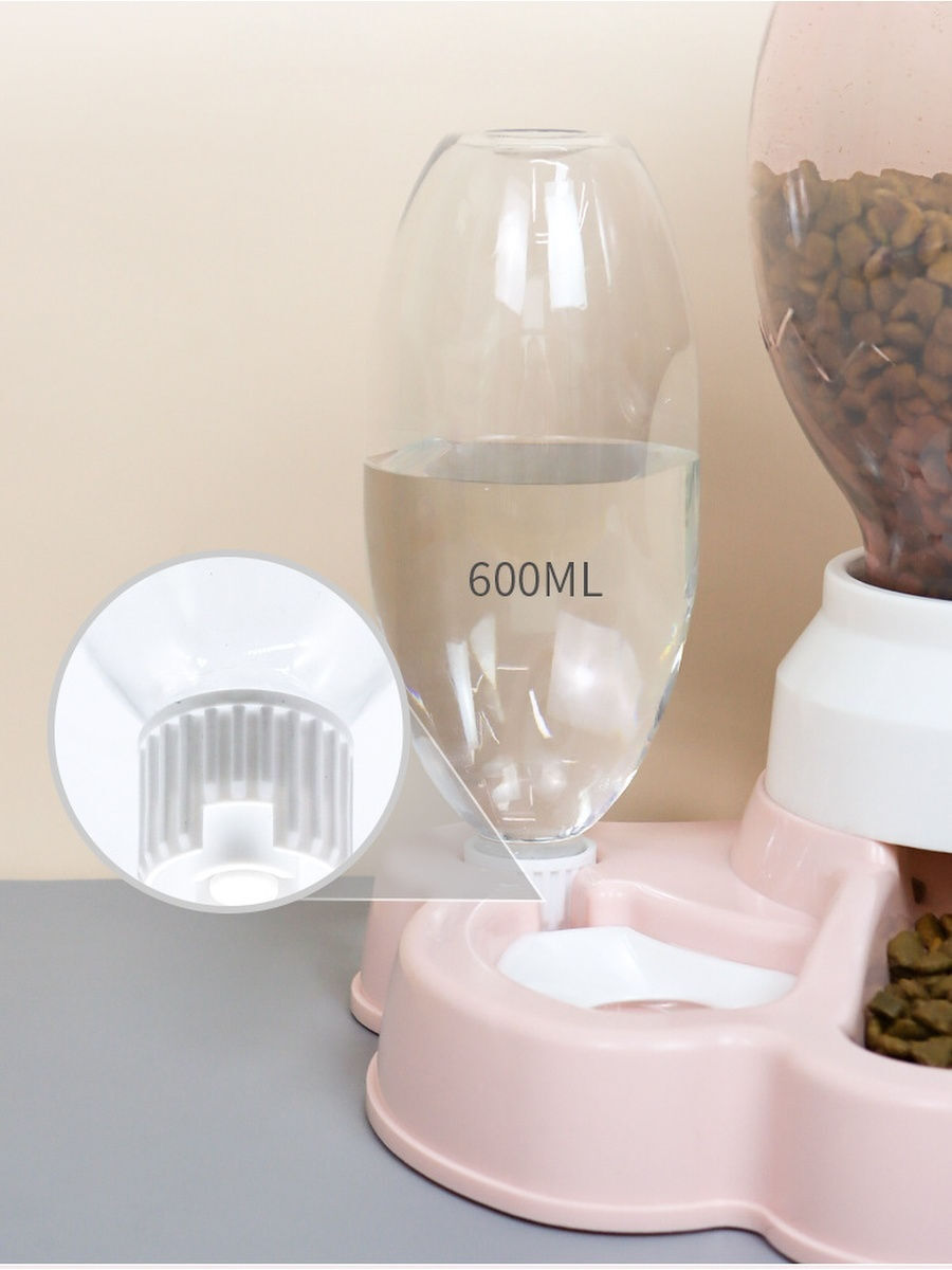 Аксессуары для кормления: Автоматическая кормушка для собак и кошек. 2.2L объем контейнера под корм. Бутылочка для воды имеет объём 600 мл. Состоит из бутылки с ограничителем, миска и поилка для животных, контейнера для корма и крышки. Изготовлена из проч