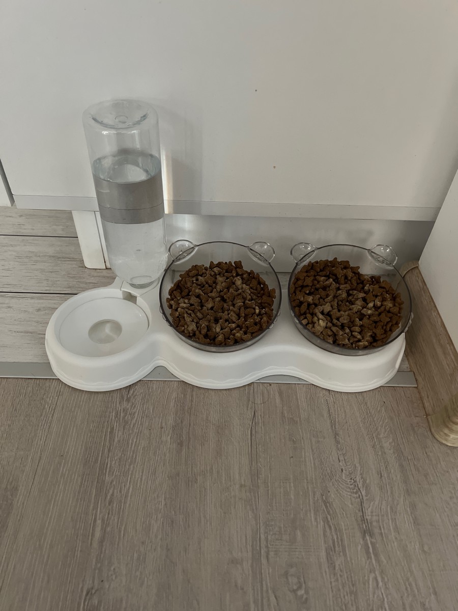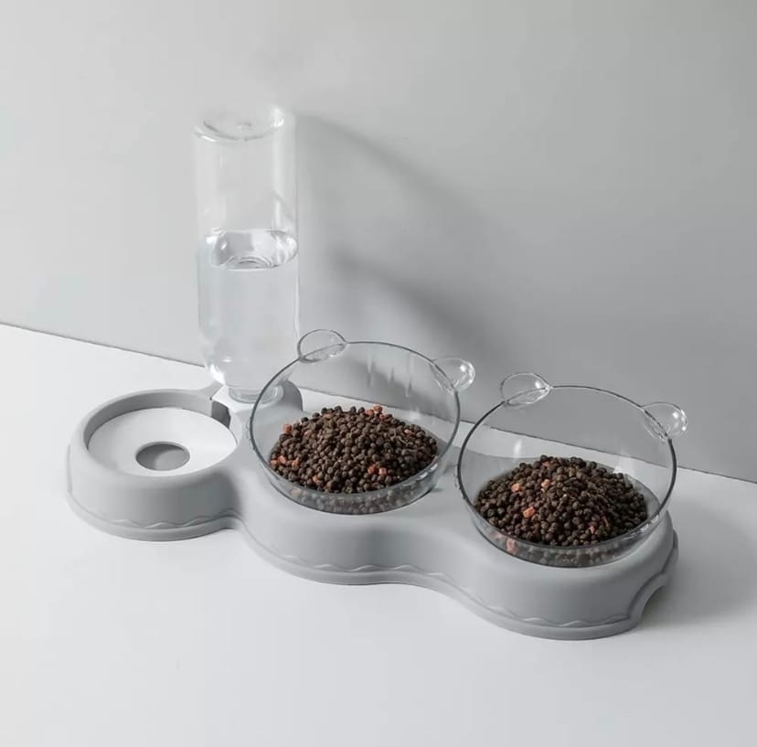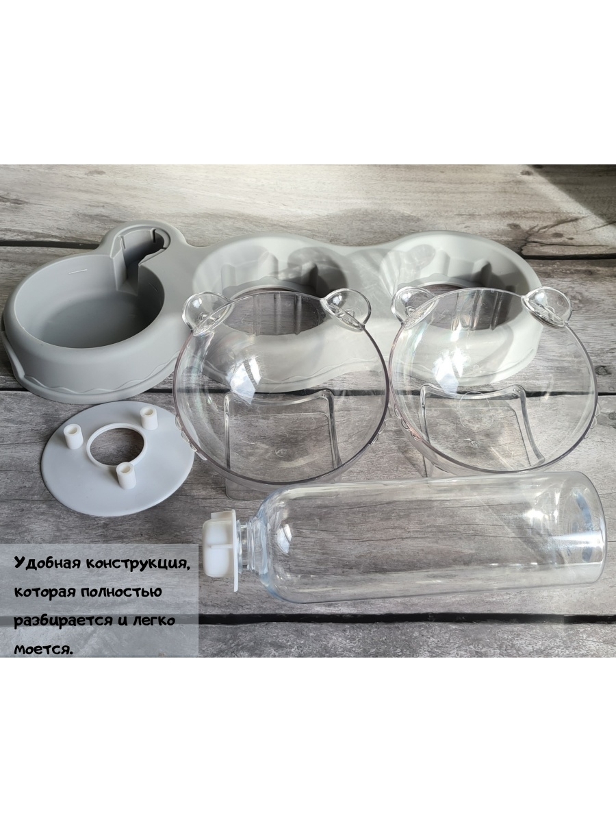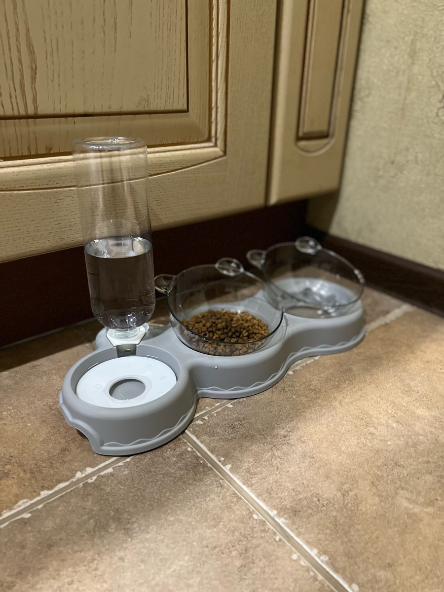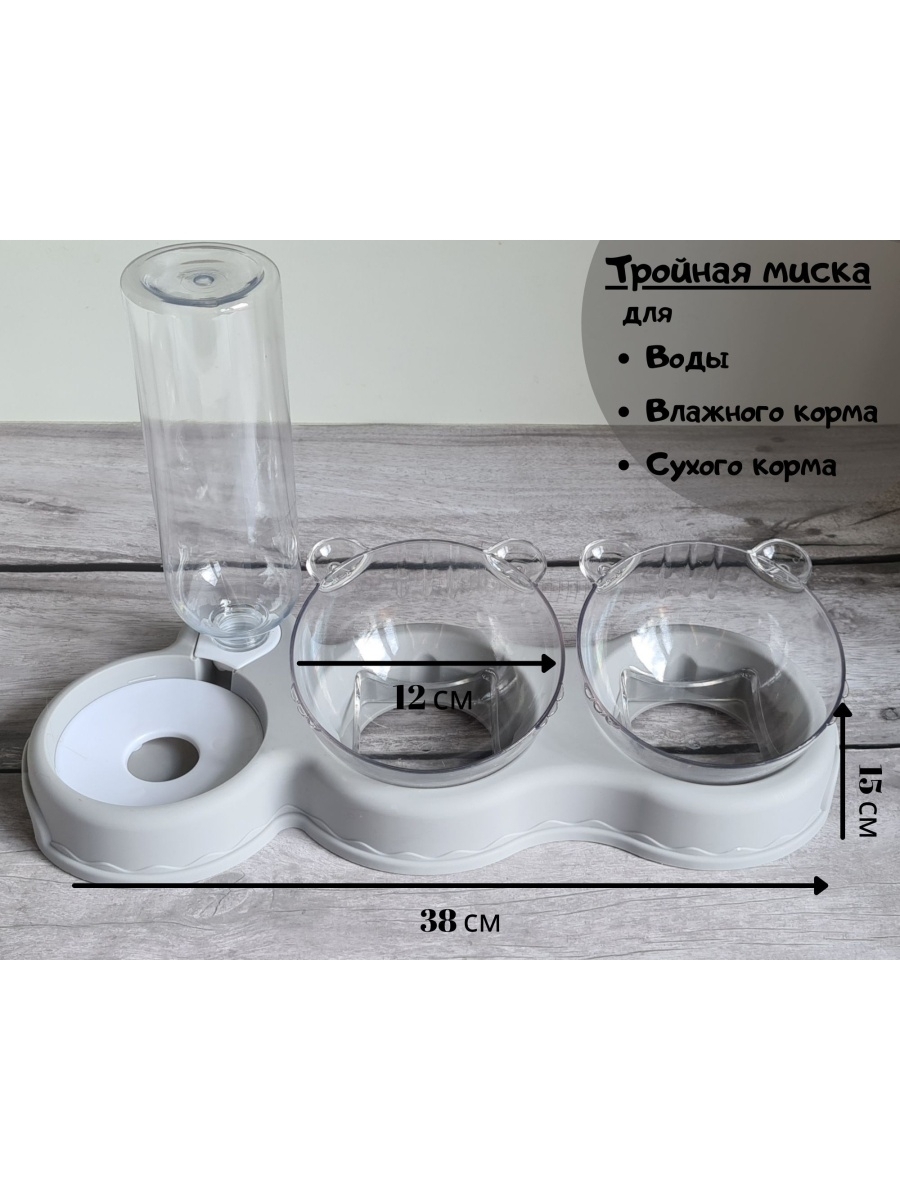 Тройная миска с автоматическим пополнением воды. Если Вам нужно отлучиться на весь день, запаса воды и еды надолго хватит вашему питомцу. Миска выполнена из прочного пластика. Съемные миски легко снимать и мыть. Бутылка для воды рассчитана на 500 мл и осн