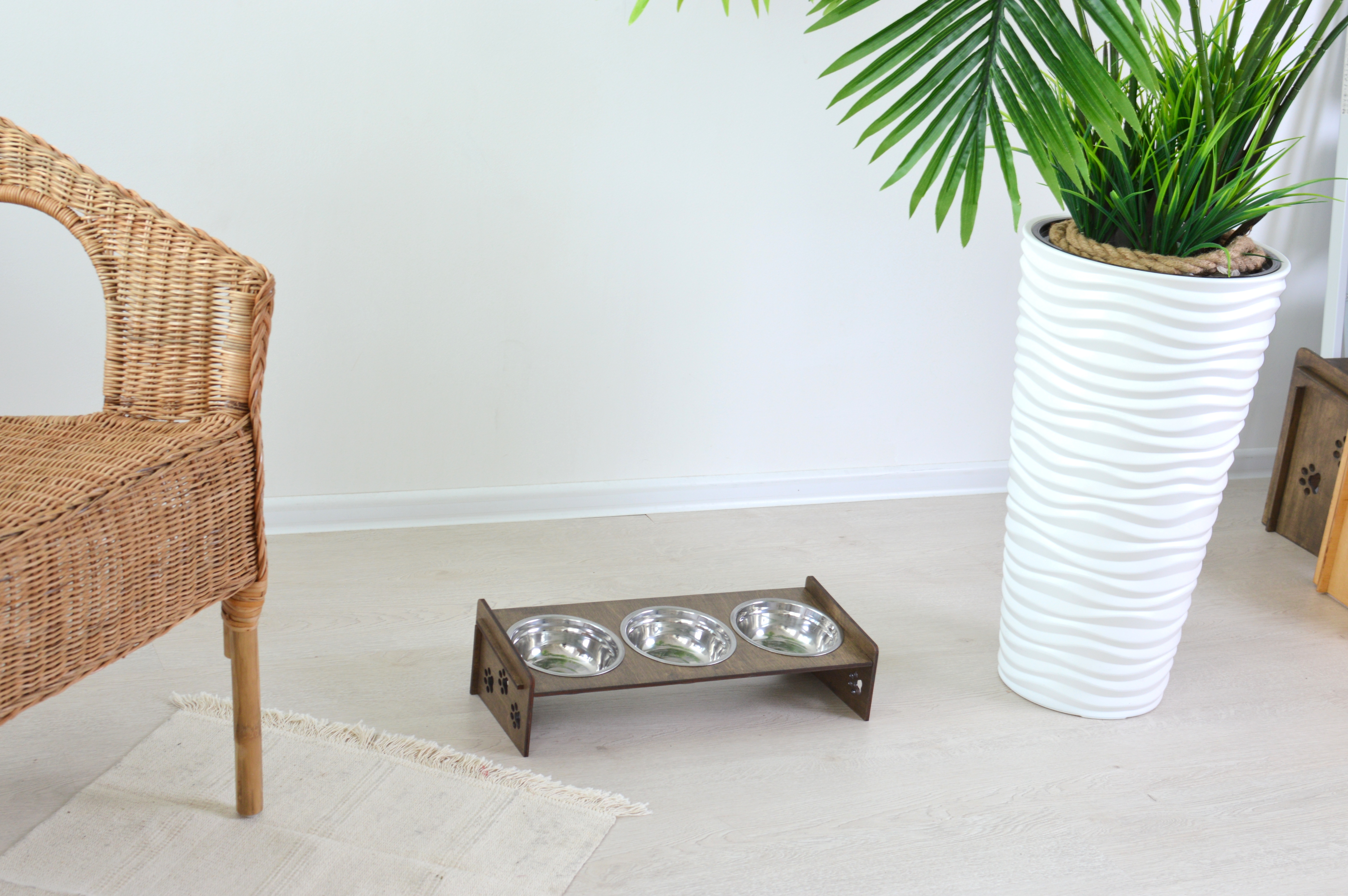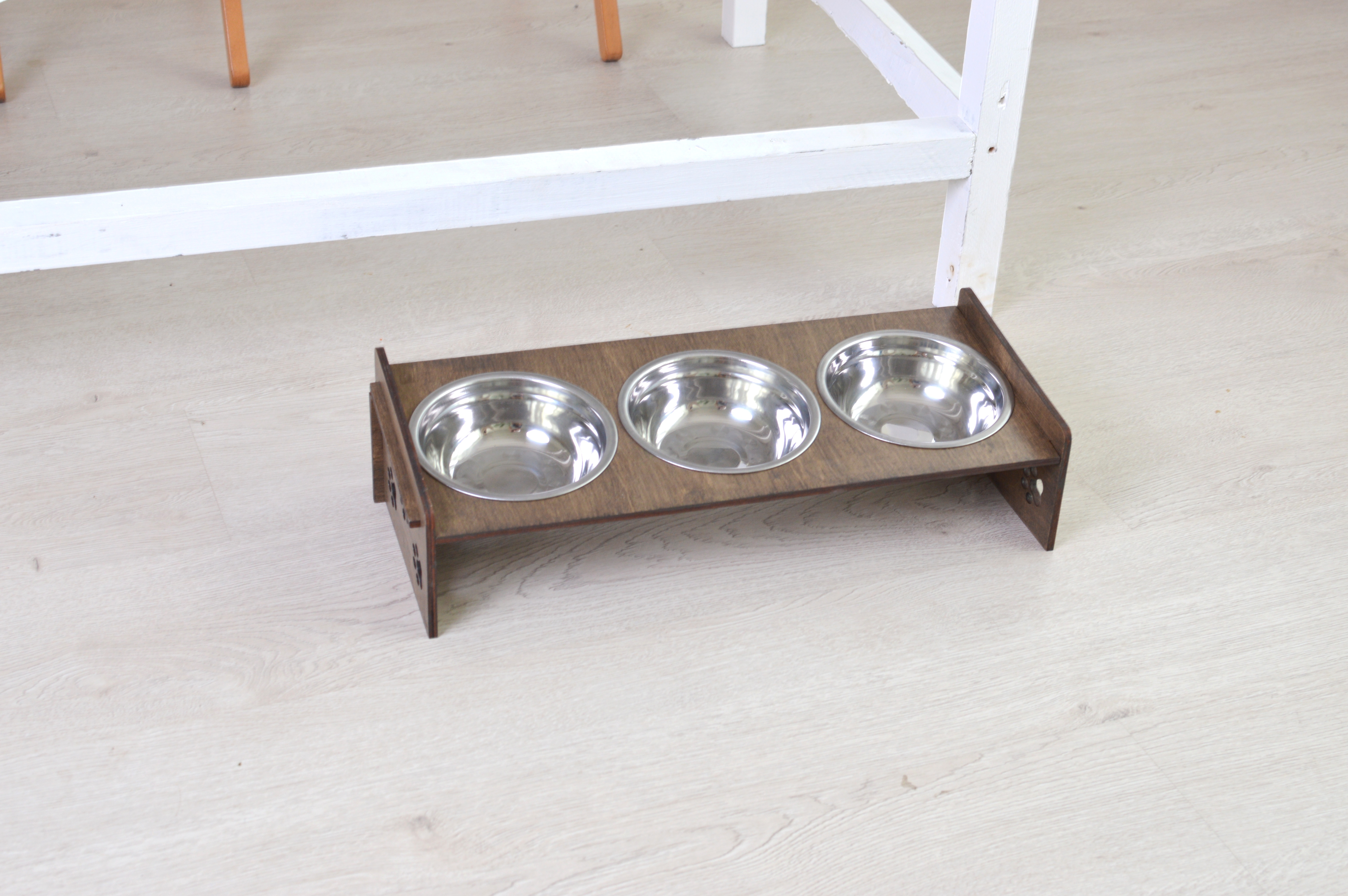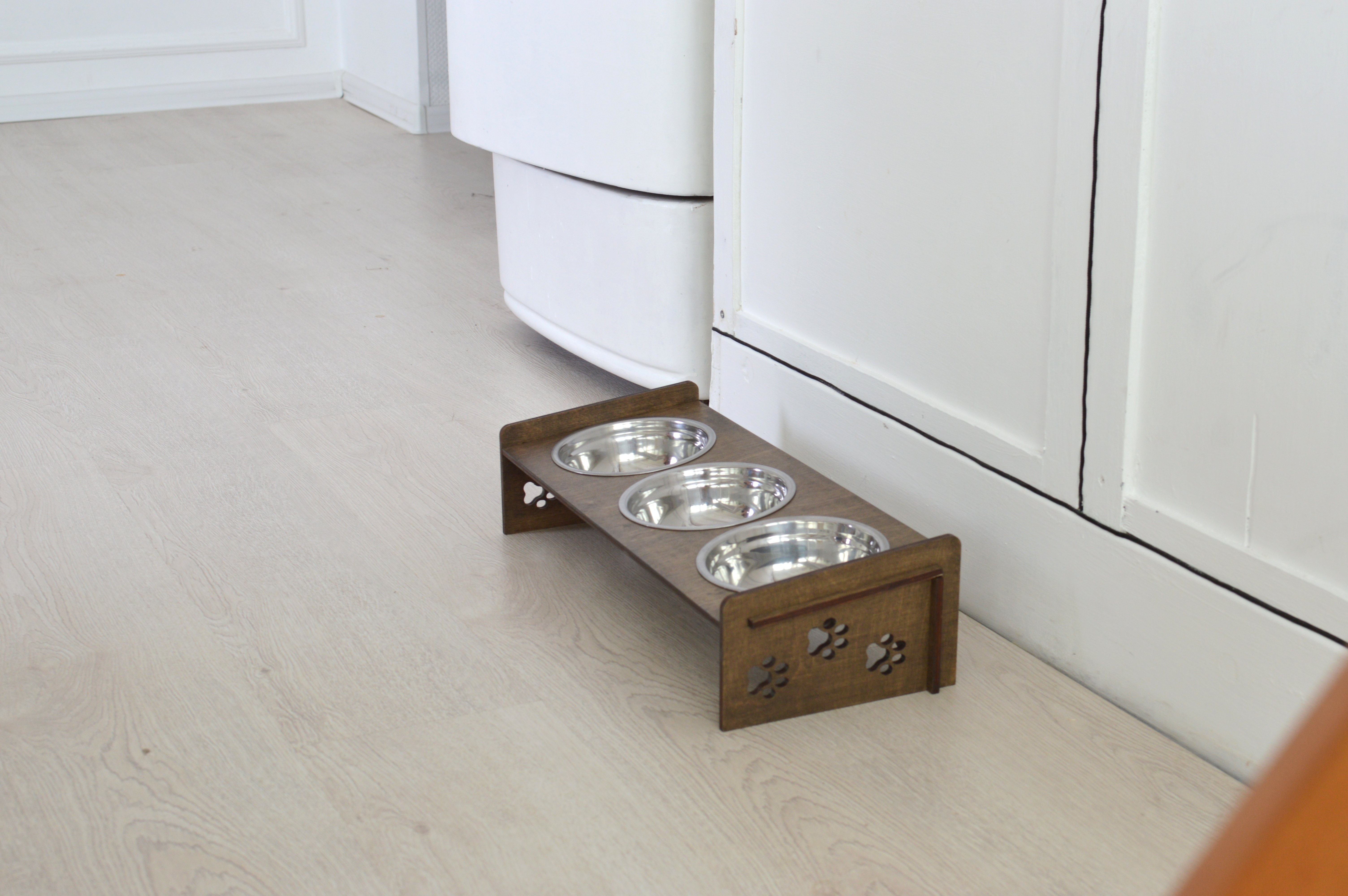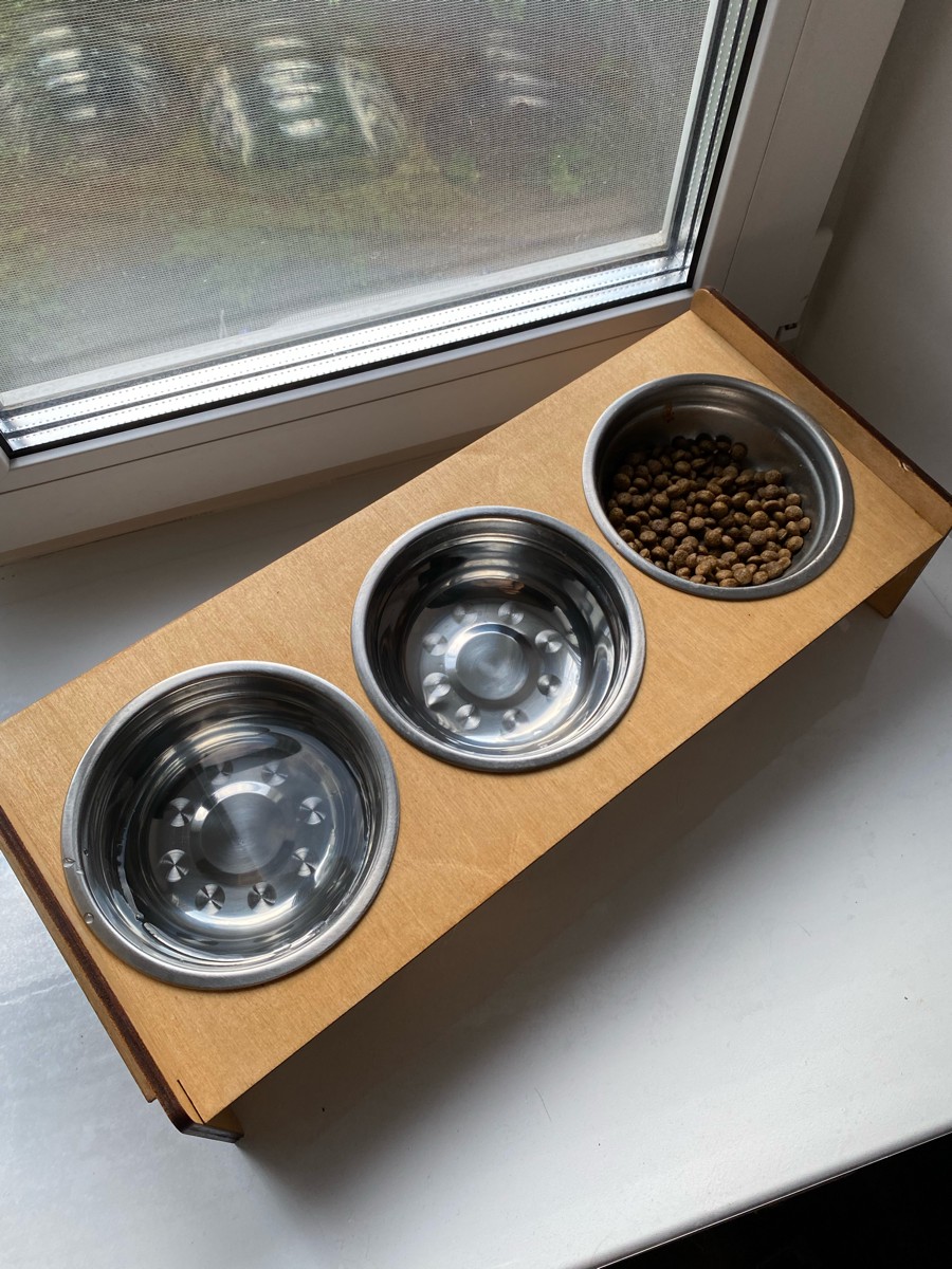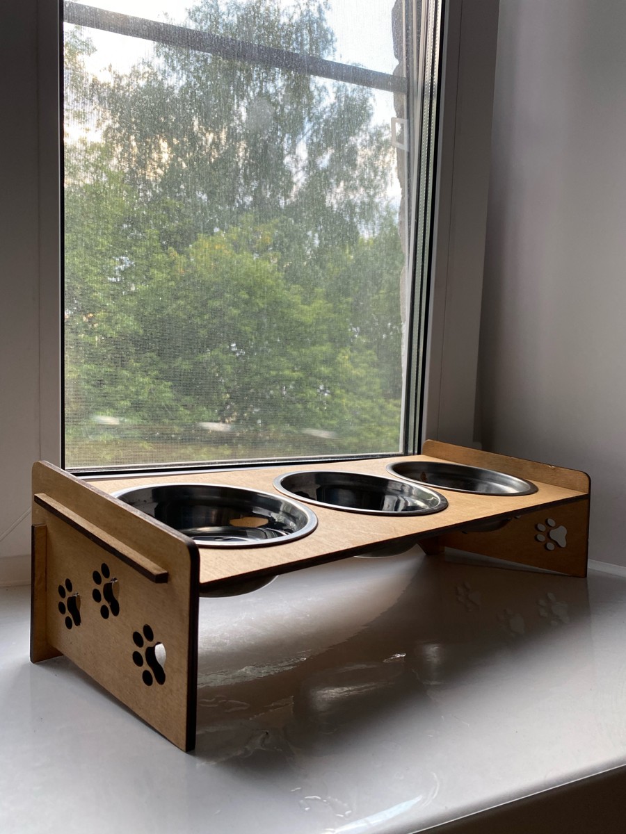 Миски для кошек (Миски для собак) на подставке из обработанной влагостойким эко-лаком фанеры, с удобным наклоном. Роскошный, стильный дизайн отлично впишется в интерьер.Подставку просто собрать - всего 4 детали и 3 миски в комплекте Миски из нержавею