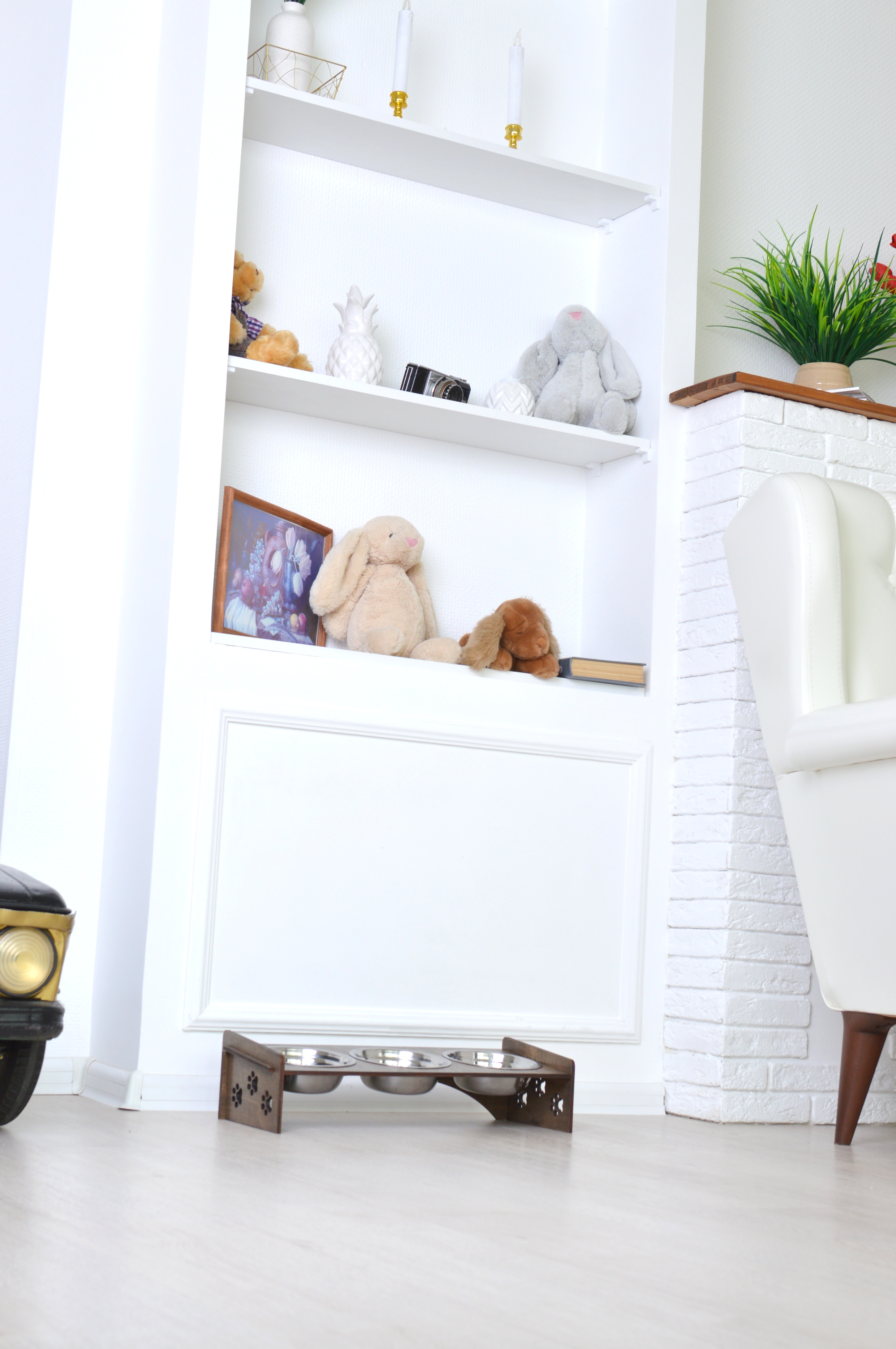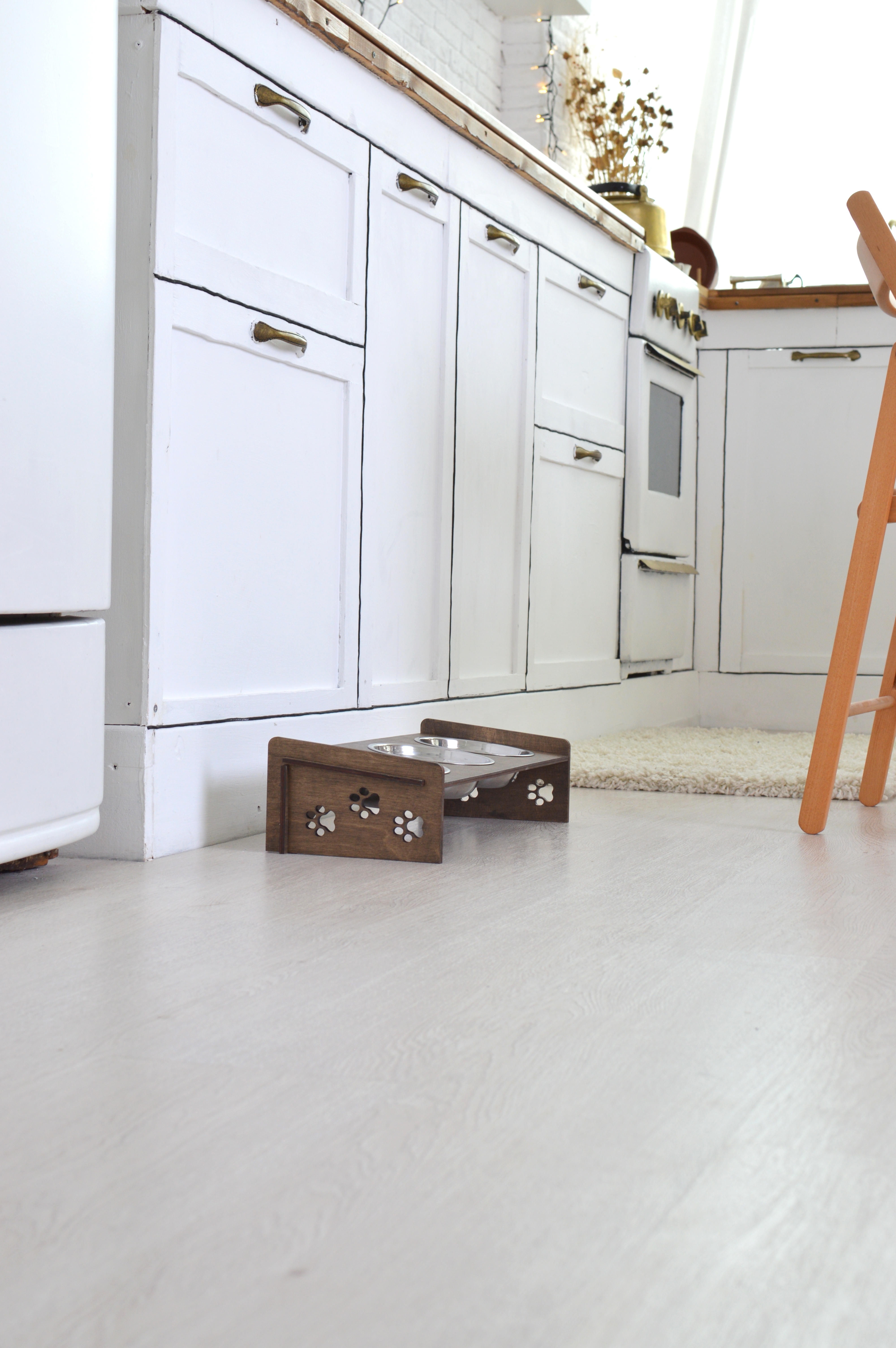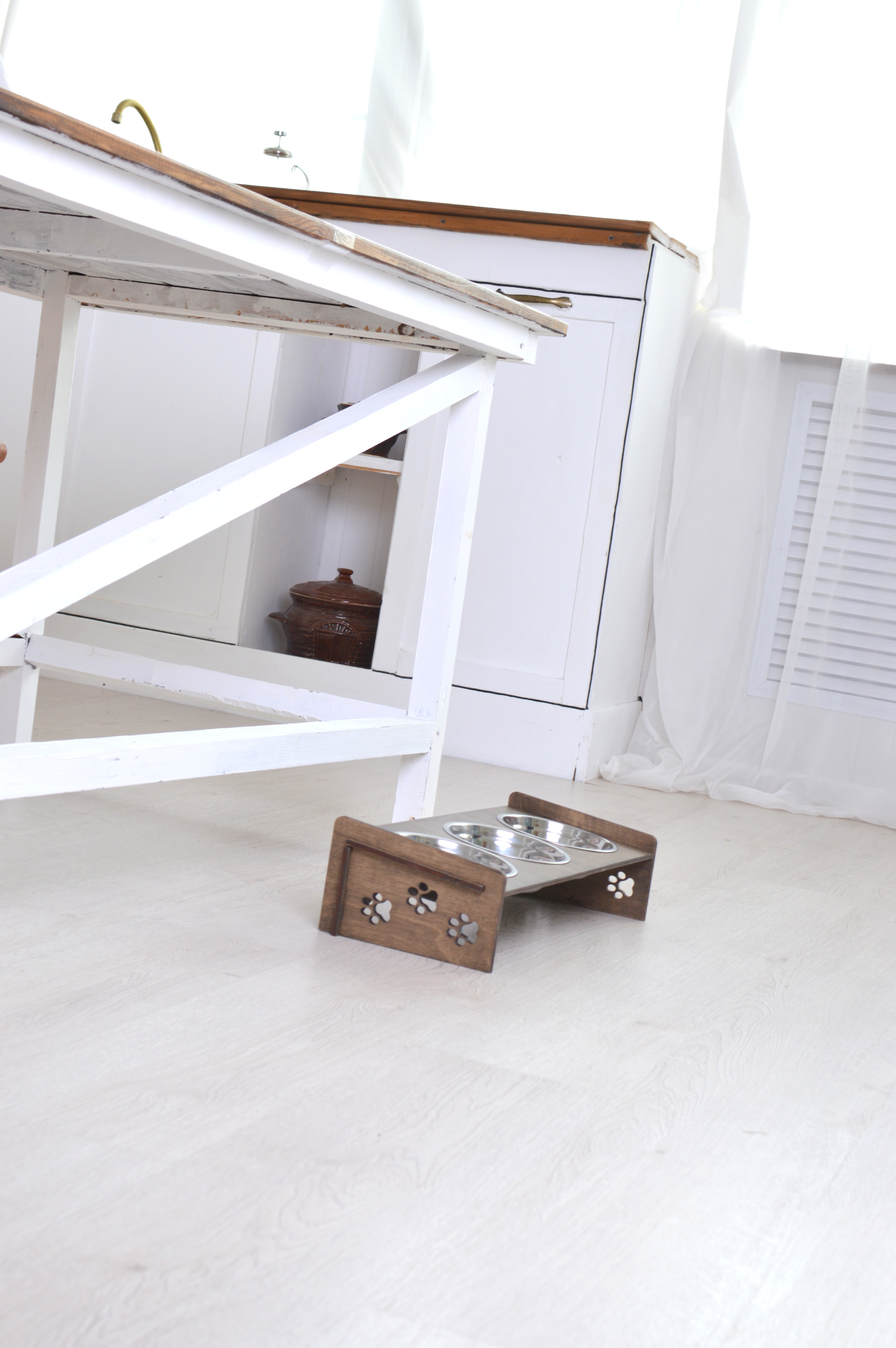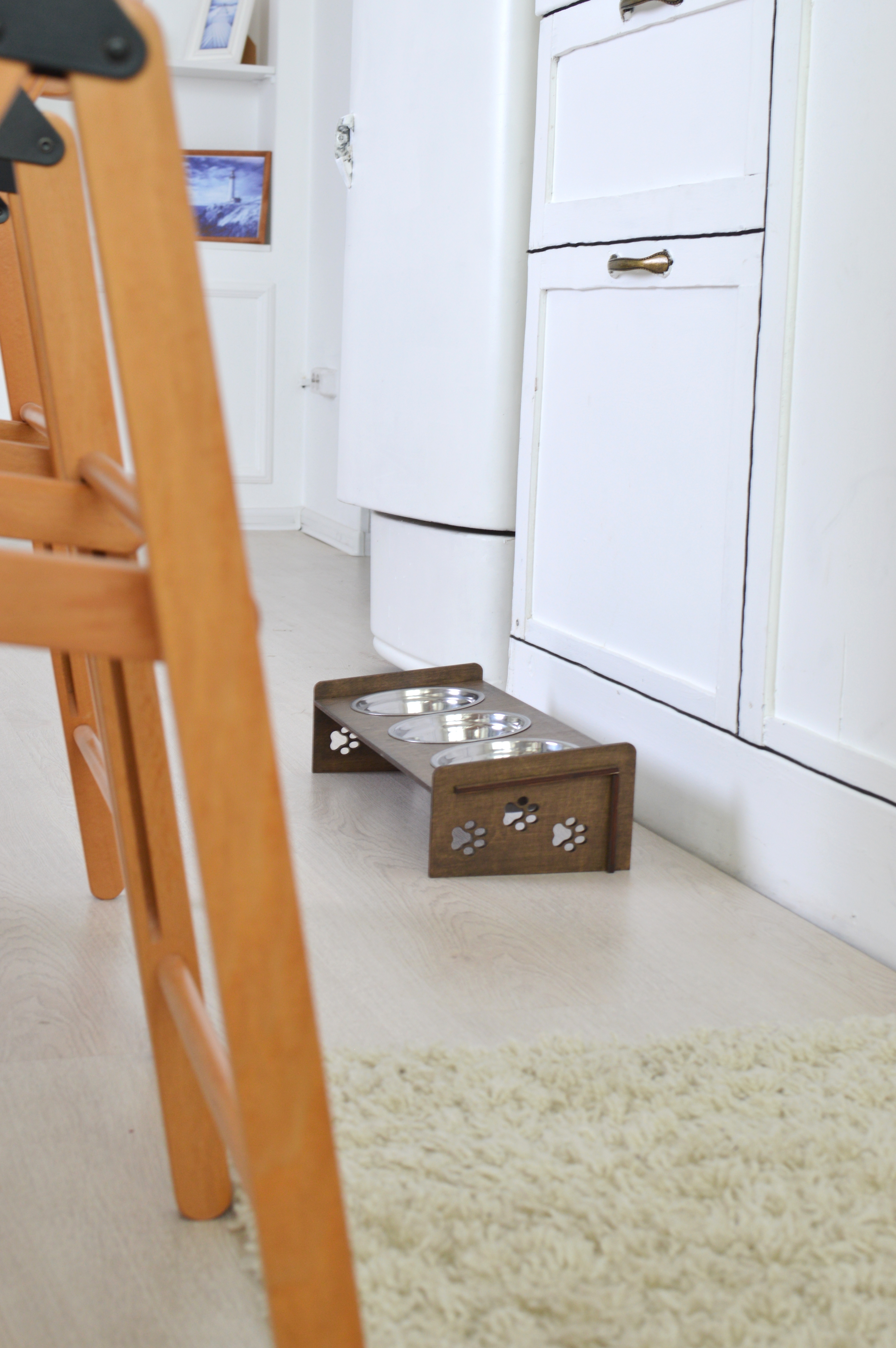 Миски для кошек (Миски для собак) на подставке из обработанной влагостойким эко-лаком фанеры, с удобным наклоном. Роскошный, стильный дизайн отлично впишется в интерьер.Подставку просто собрать - всего 4 детали и 3 миски в комплекте Миски из нержавею