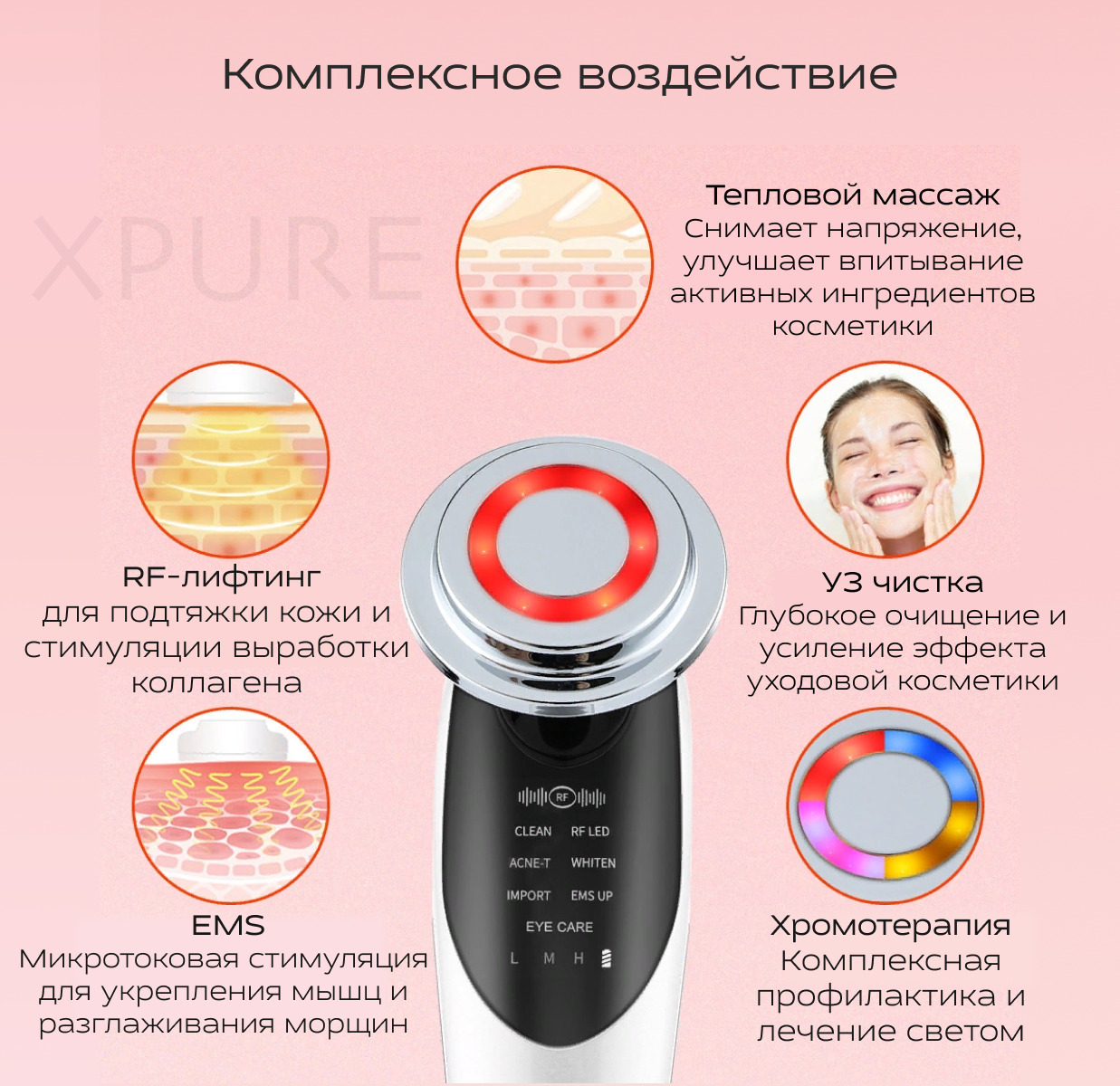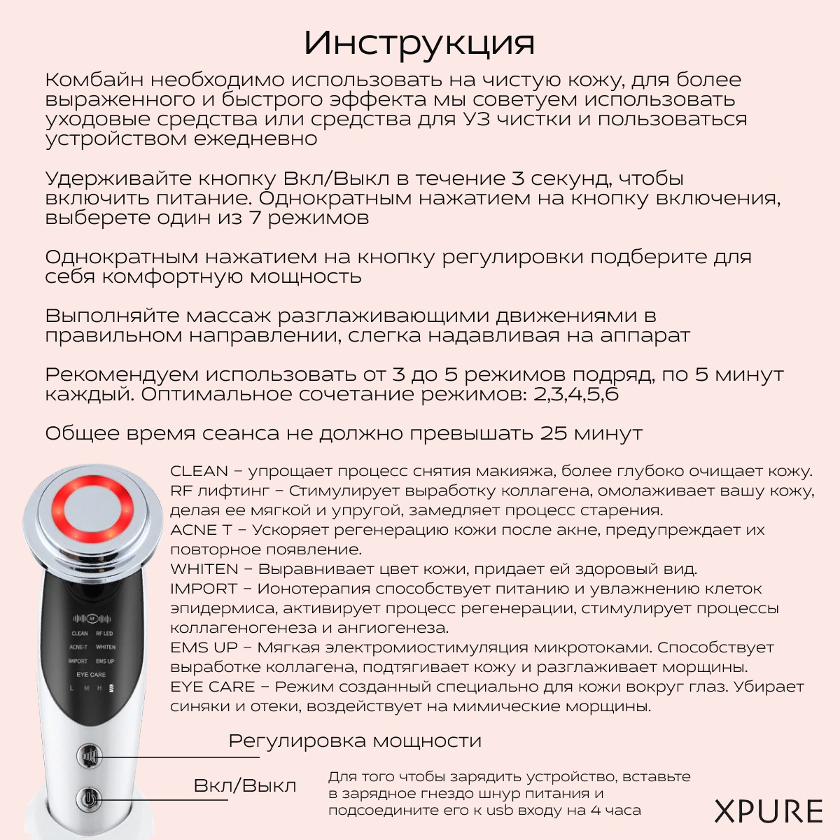 Способ применения:Согласно инструкции. Подходит для лица и тела Комплектация:Ультразвуковой косметологический микротоковый комбайн-массажер для лица и тела XPURE 1шт, USB шнур,подарочная упаковка