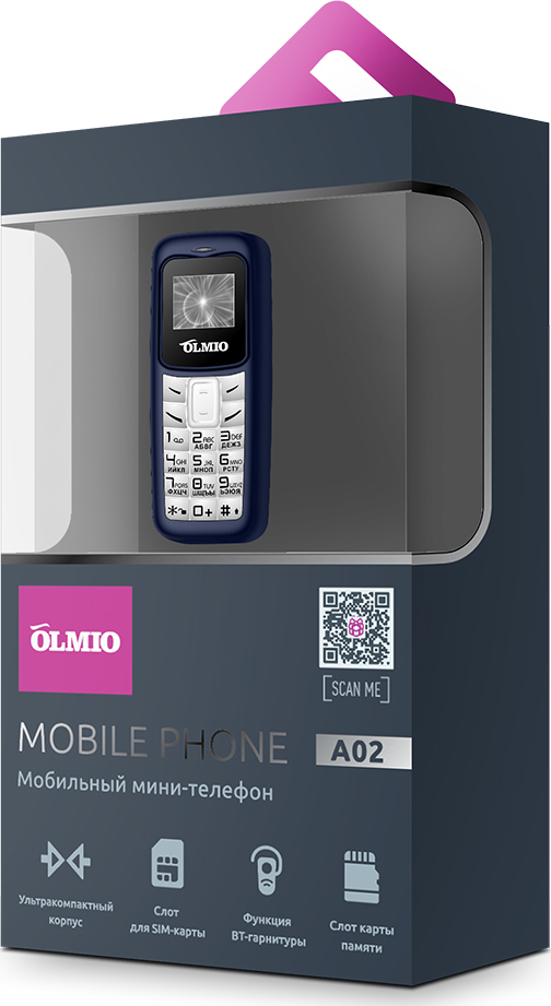 Комплектация:Мобильный телефон, аккумулятор, заушина, кабель для зарядкиОписание:Olmio A02 — мобильный телефон и Bluetooth-гарнитура в одном. Максимально компактный, но полностью рабочий, легкий и функциональный аппарат.Размеры Olmio A02 поражают с первог