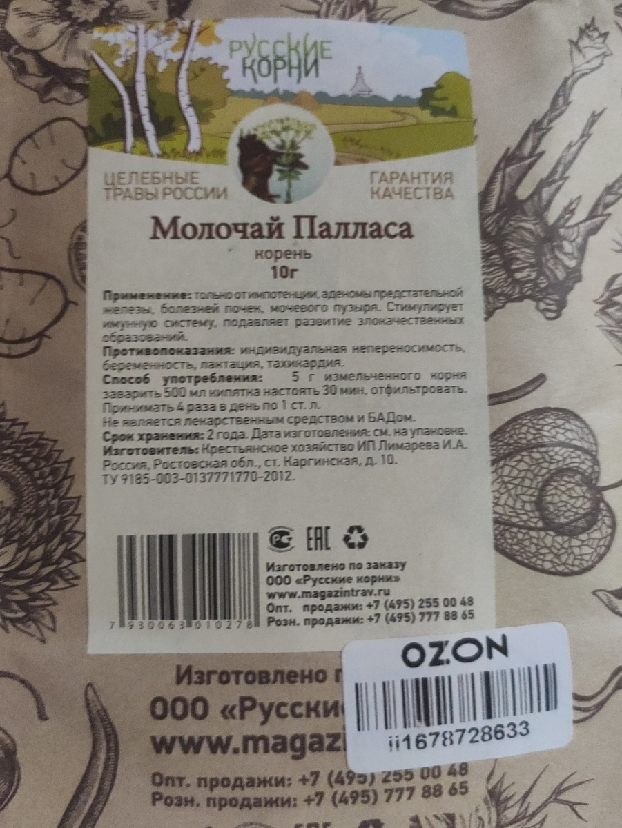 Состав:молочай Палласа, флавоноиды, дубильные вещества, аскорбиновая кислота, селен.Описание:Корень Молочая Палласа (Мужик-корень) – это эффективное антибактериальное, противовоспалительное и ранозаживляющее средство. Корень молочая Палласа обладает общеу
