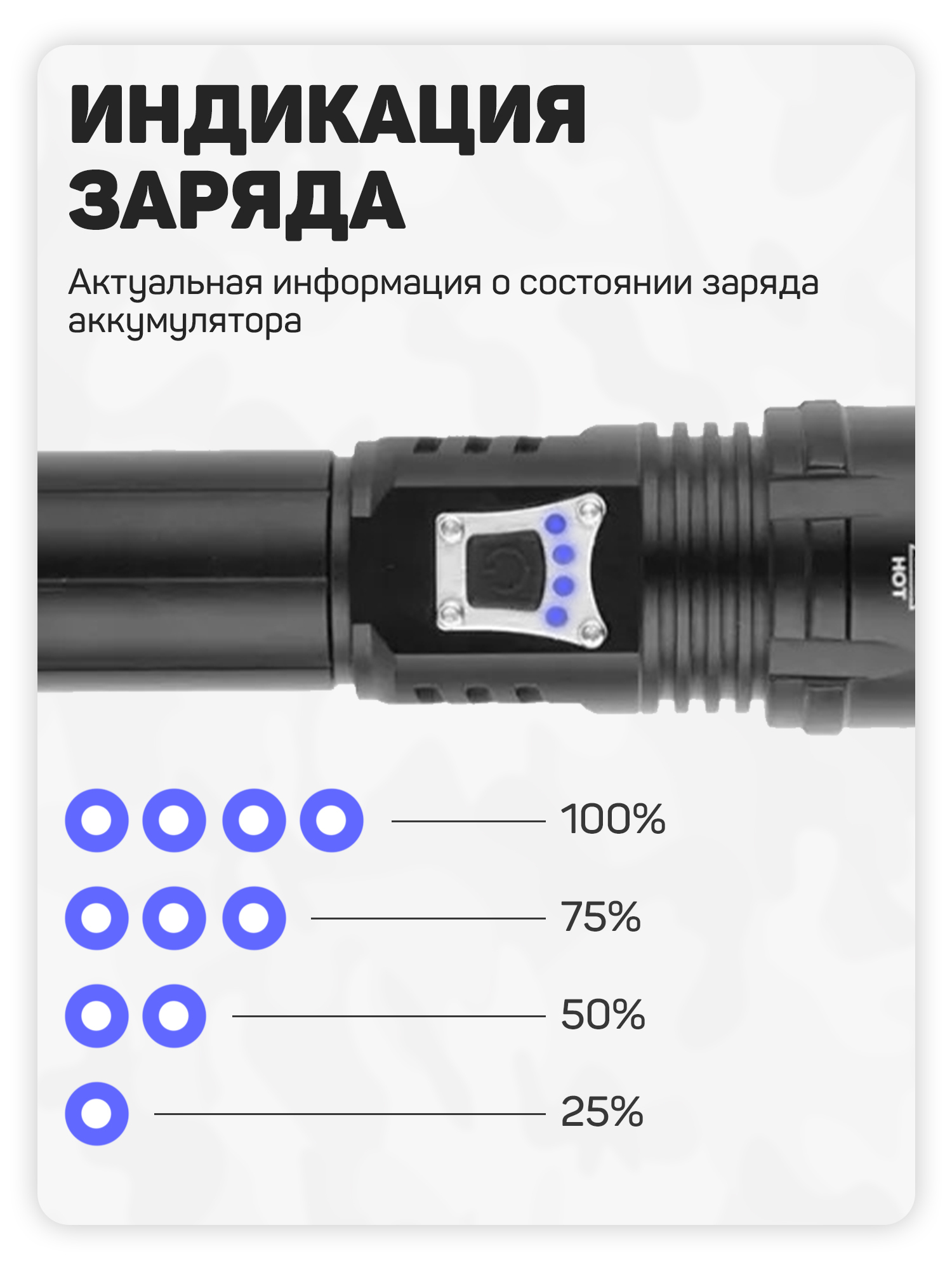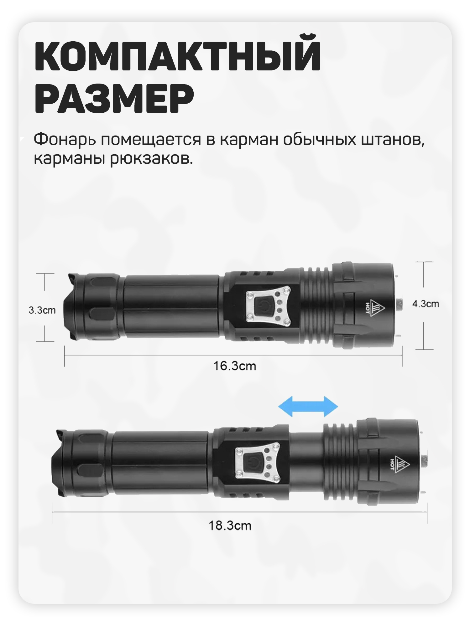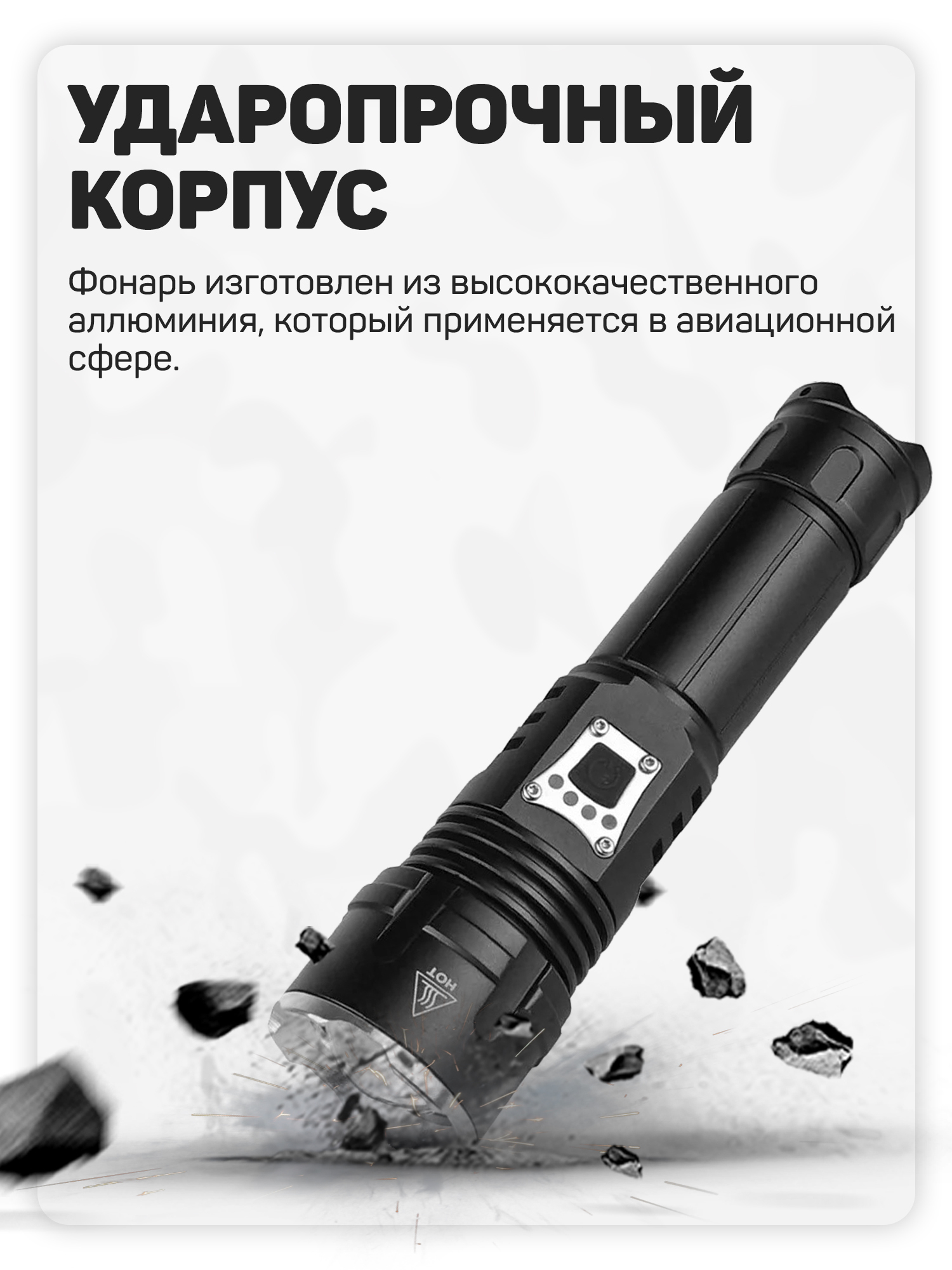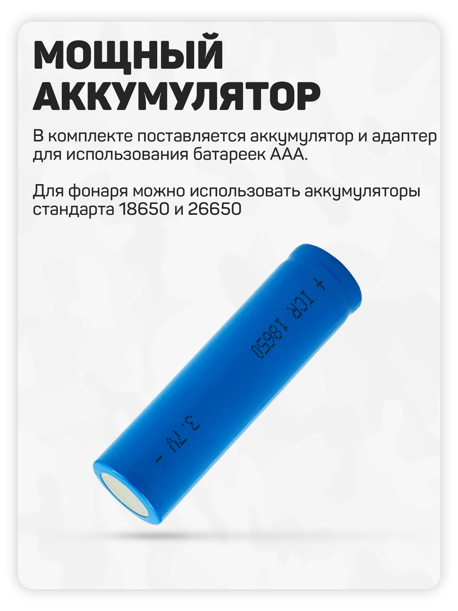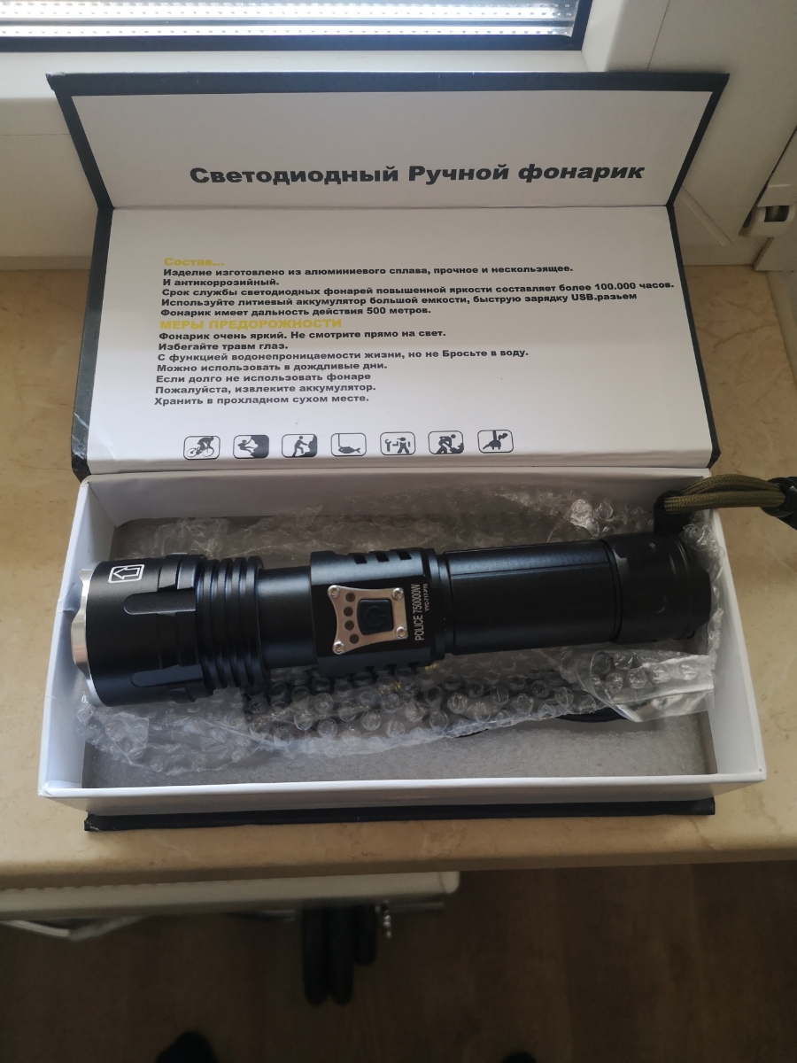 Комплектация:Фонарик светодиодный - 1шт, Кабель питания USB - 1шт, аккумулятор 18650 - 1шт; кассета для 3 батареек AAA -1шт; подарочная коробка на магните - 1шт.Описание:Мощный светодиодный фонарь с использованием инновационного светодиода XHP70, который