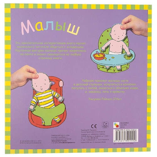 АннотацияЗамечательная интерактивная книга «Малыш» научит маленького читателя общаться с младенцем.Ребенок поможет малышу сесть в детский стульчик, искупаться в ванночке, погулять с папой, оказаться в объятиях мамы, и, наконец, лечь в кроватку.Картонная фигурка ма