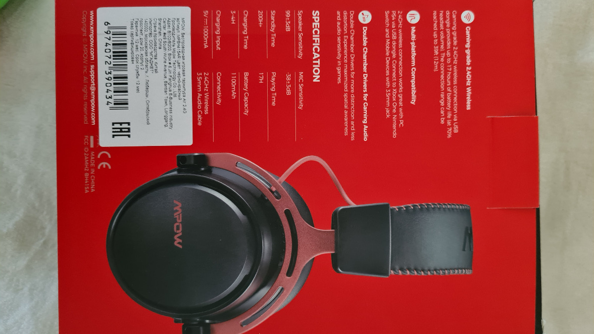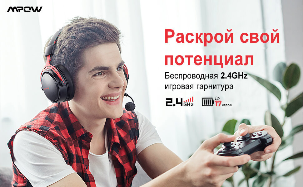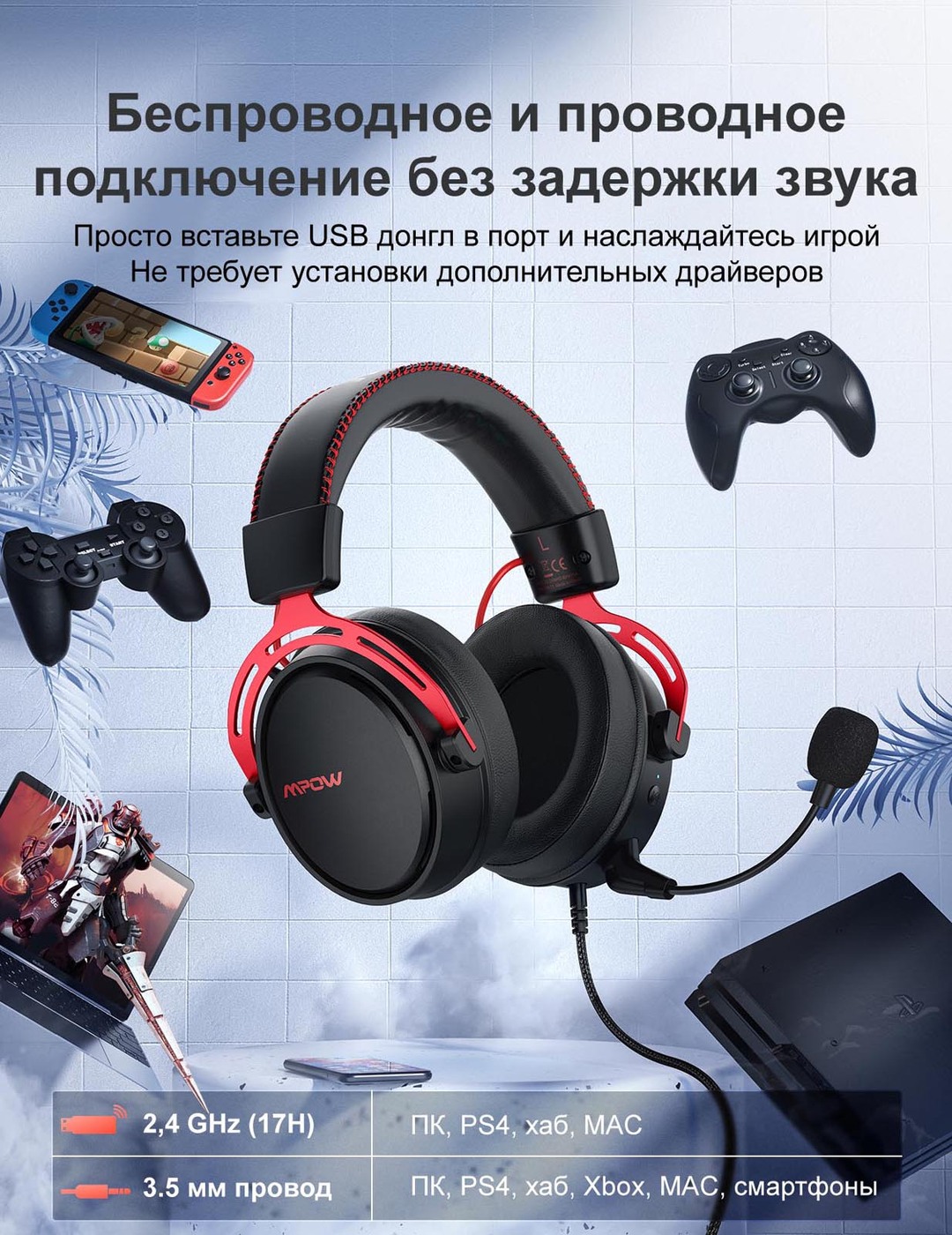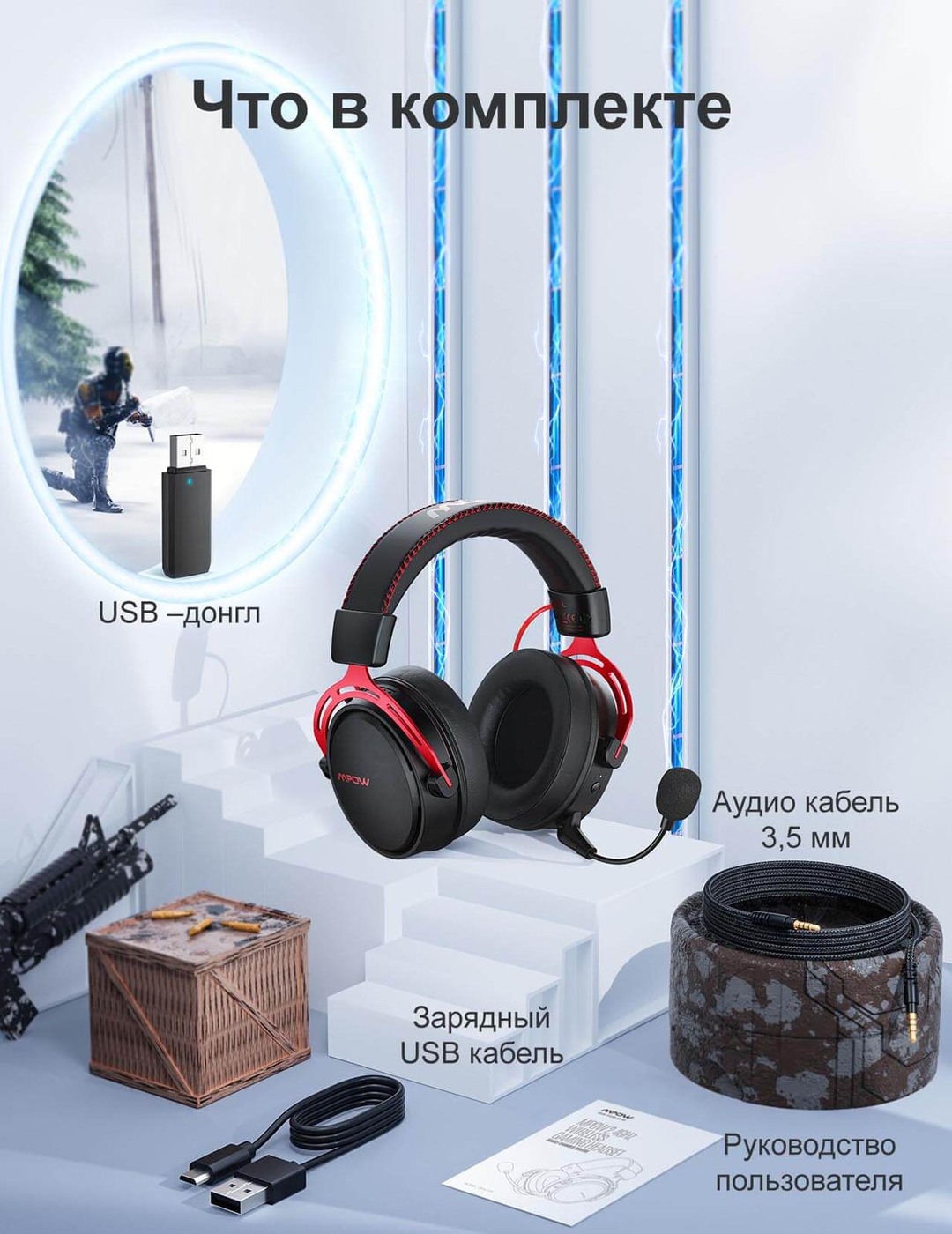 Комплектация:USB донглАудиокабель 3,5 мм - 1 шт.1 х зарядный кабель micro USB1 х инструкцияОписание:Погрузитесь в атмосферу трехмерного звука с помощью игровой гарнитуры Mpow Air 2.4ГГц с 50-миллиметровыми динамиками. Технология беспроводного подключения