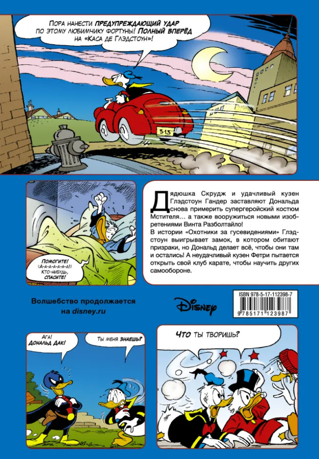 Дядюшка Скрудж и удачливый кузен Глэдстоун Гандер заставляют Дональда снова примерить супергеройский костюм Мстителя… а также вооружиться новыми изобретениями Винта Разболтайло! В истории "Охотники за гусевидениями" Глэдстоун выигрывает замок, в котором о