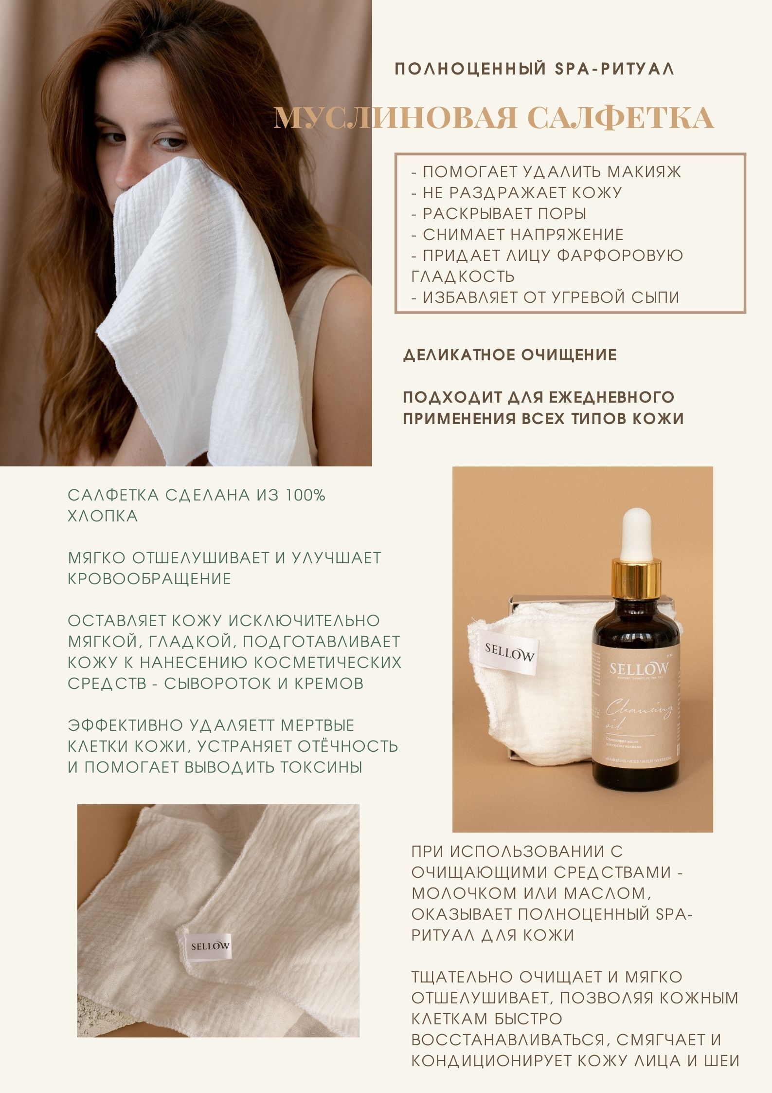 Состав средства:100% - хлопокКомплектация:упаковка, салфеткаОписание:Муслиновая салфетка - это полноценный spa-ритуал для кожи лица. Она помогает удалить макияж, не раздражая кожу. Раскрывает поры и снимает напряжение. Придаст лицу фарфоровую гладкость и