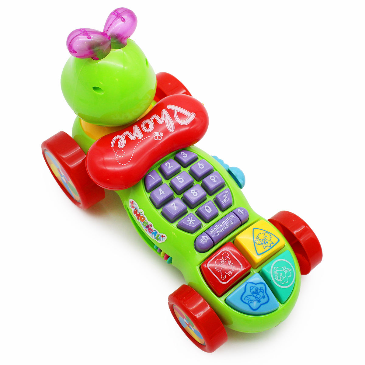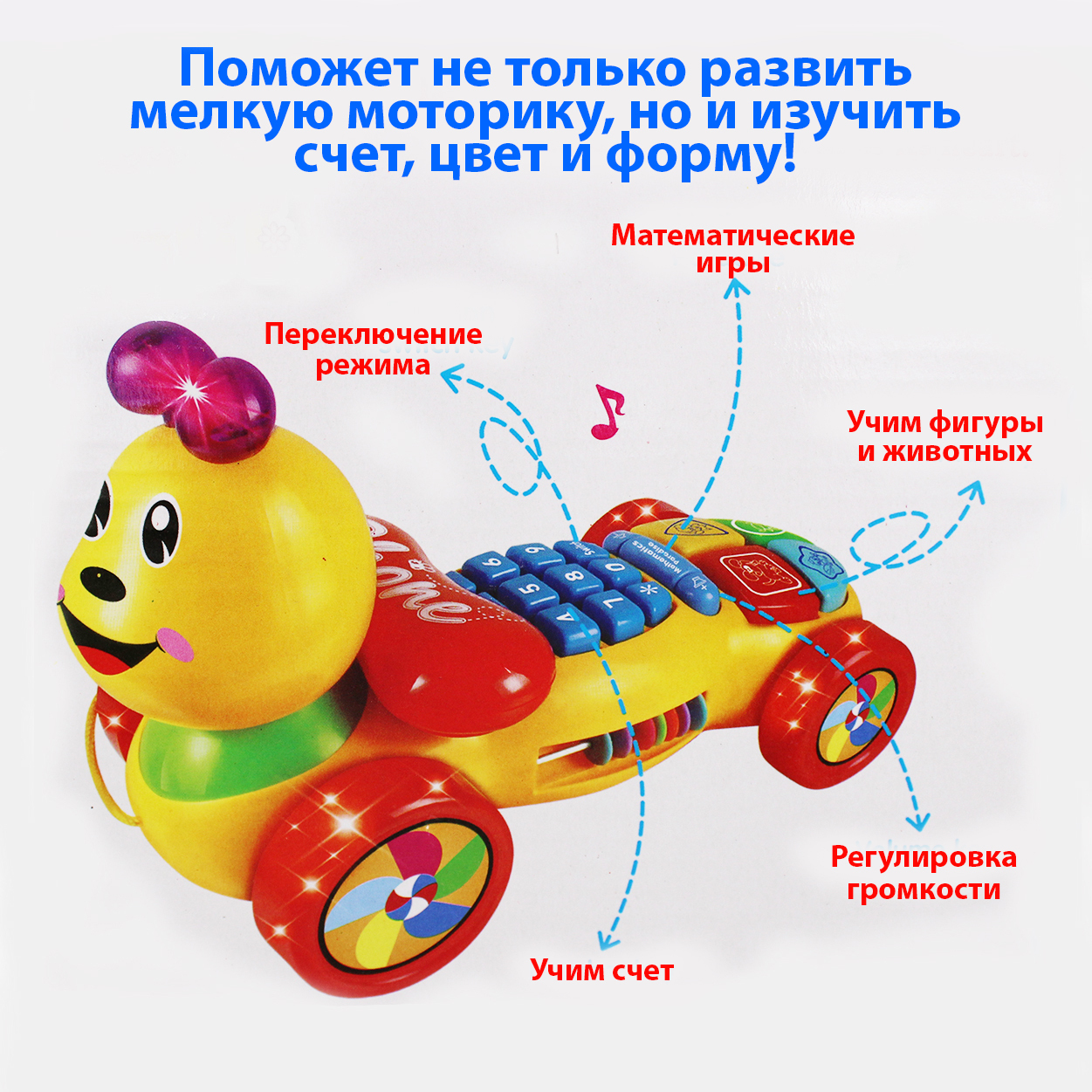 Это не только игрушка-каталка, но и настоящая музыкальная игрушка, сочетающая в себе телефон, счет, музыку, игры и многое другое. Отличается звонким приятным звучанием. Именно поэтому он станет замечательной игрушкой для вашего малыша. Он способен заинтер