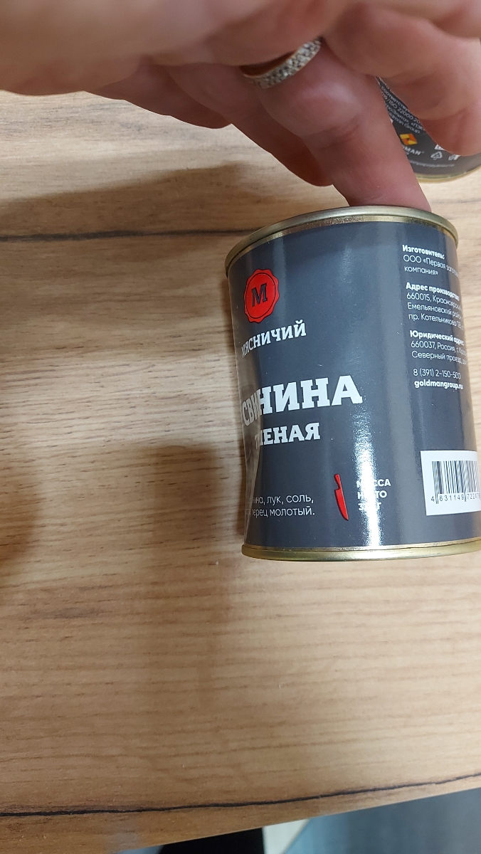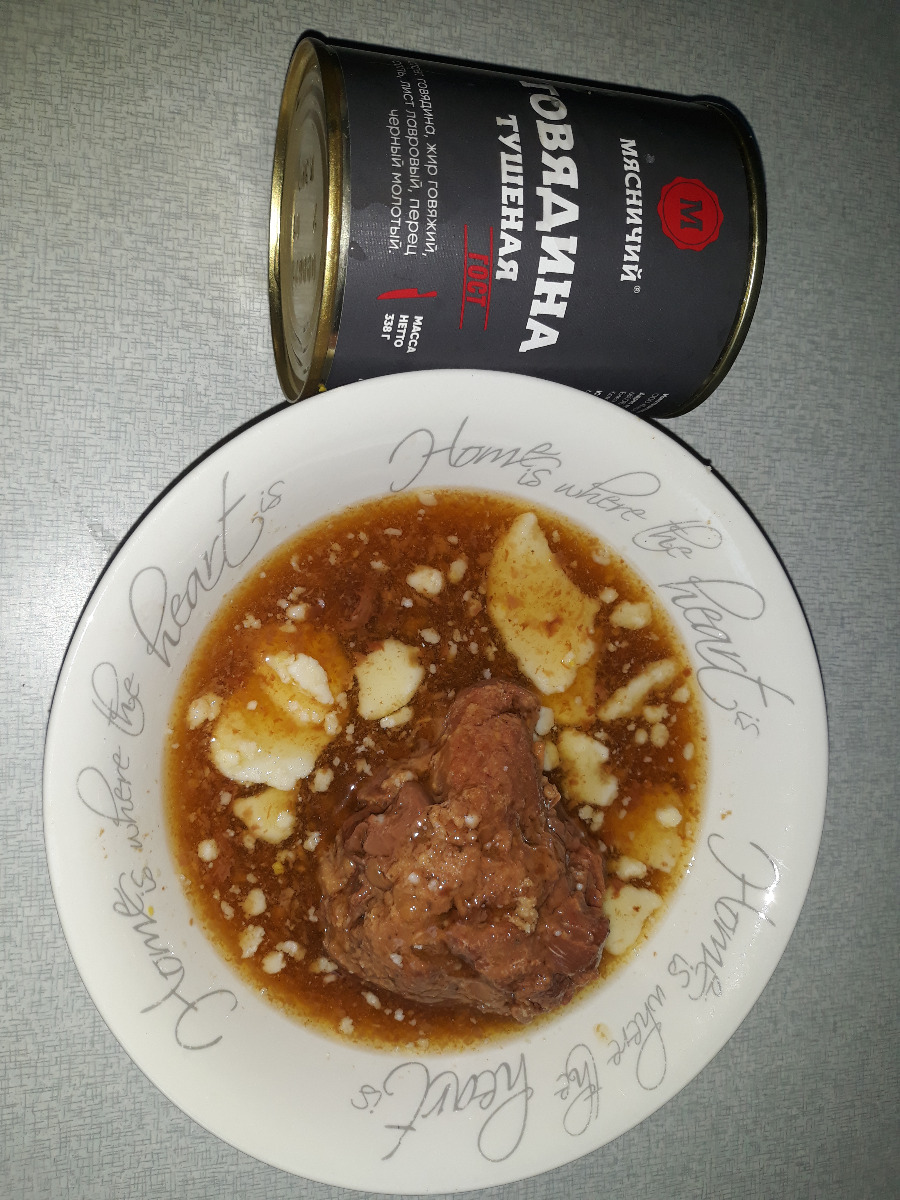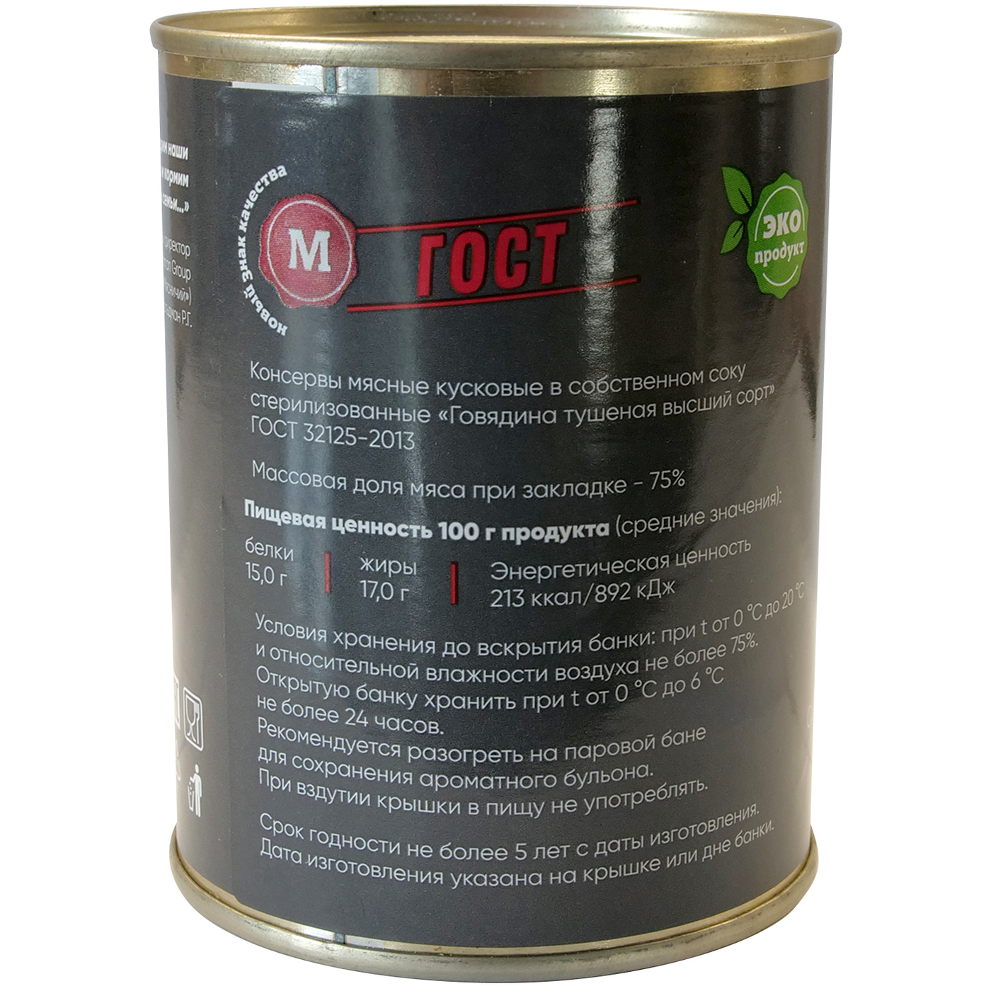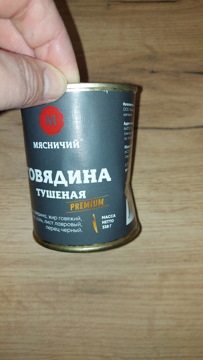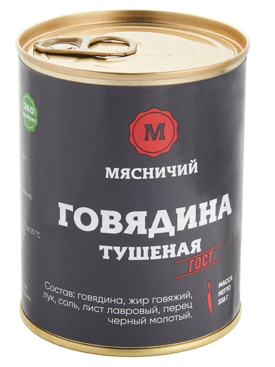Условия хранения:Хранить в темном прохладном местеСостав:говядина;говяжий жир топленый;лук репчатый;соль поваренная пищевая;лист лавровый;перец черныйКомплектация:банка с ключомОписание:Классический вид тушенки из говядины с закладкой мяса 75%. Честный и